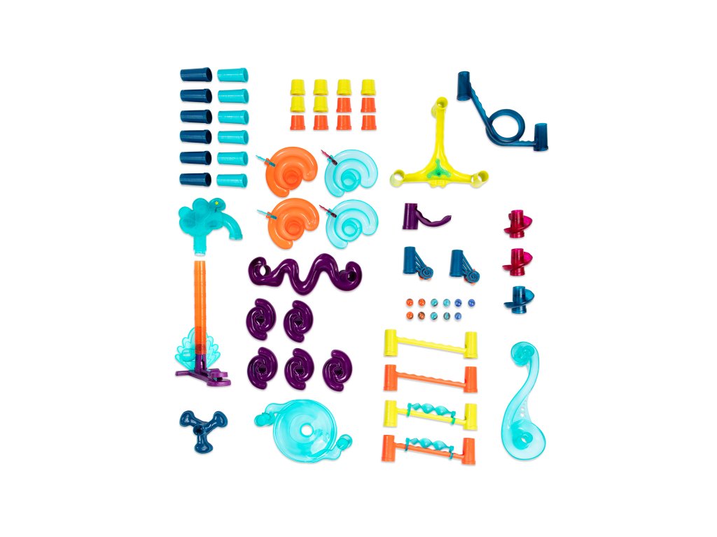 Súprava obsahuje 51 dielov dráhy a 11 guličiek.