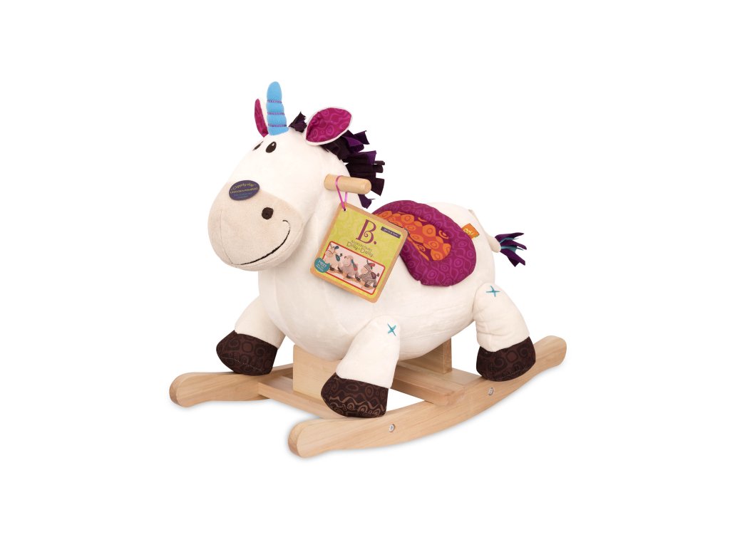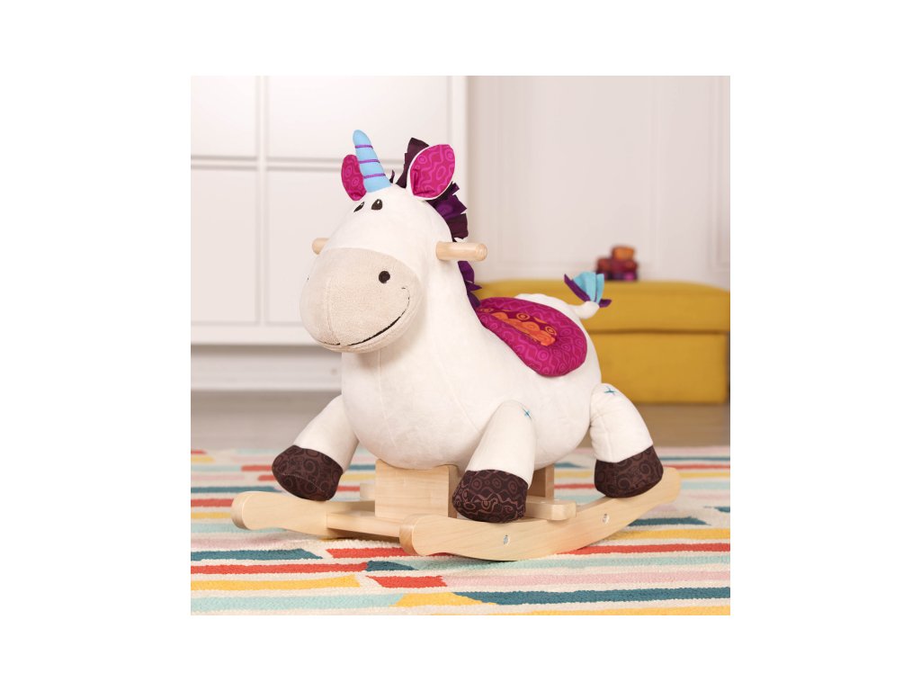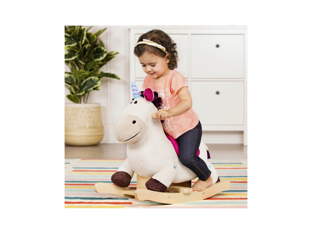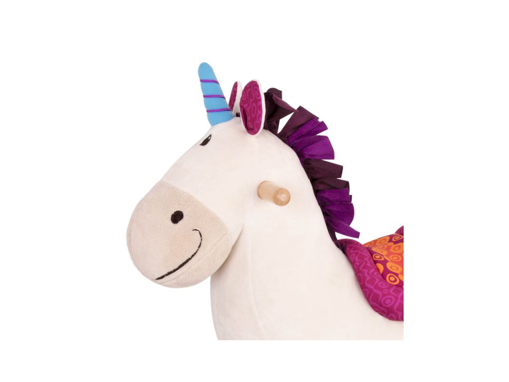 Rozkošný plyšový hojdací jednorožec s drevenou základňou a držadlami. Počas hojdania sa ozýva klapot kopýtok.