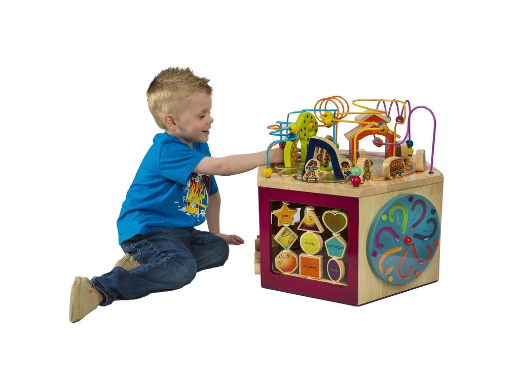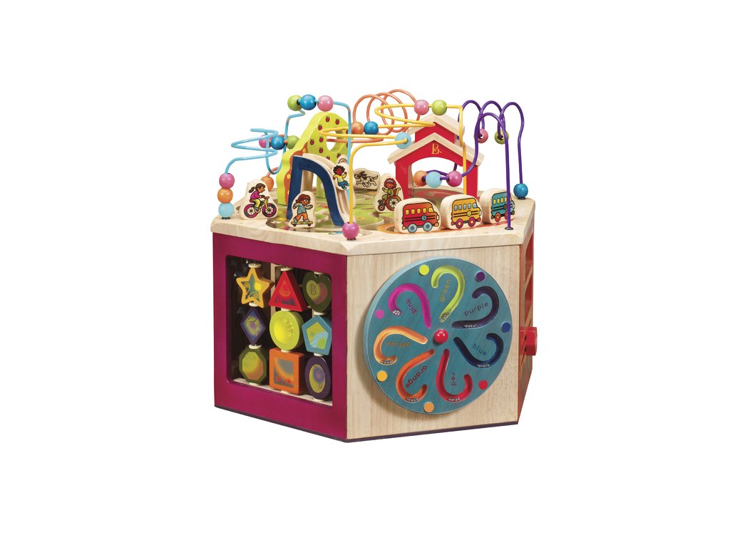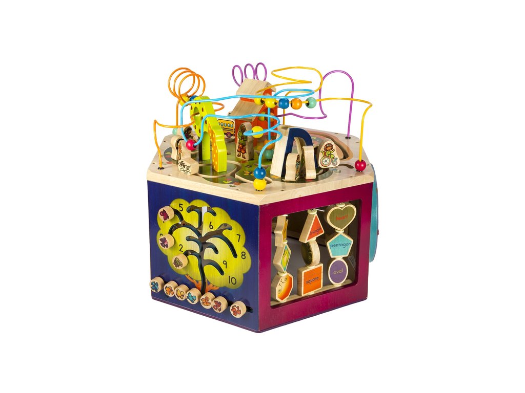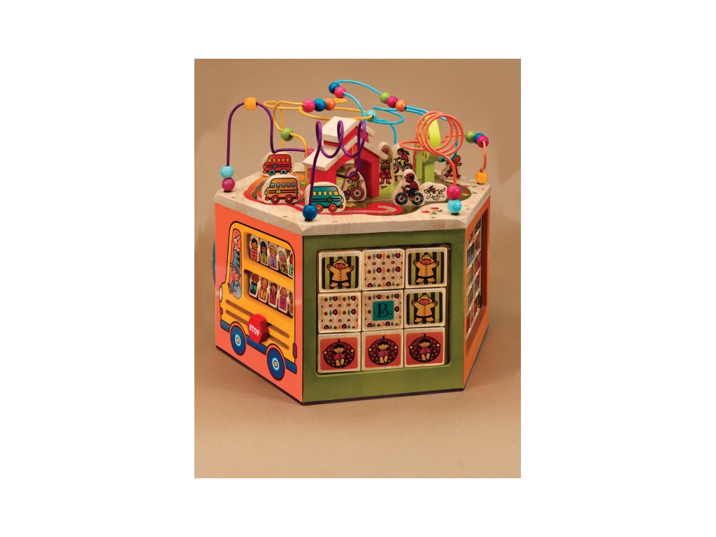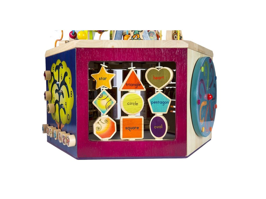 Unikátne drevené hracie centrum s množstvom pohyblivých rôznorodých aktivít zaistí vášmu dieťaťu hodiny zábavy. Vďaka svojej veľkosti zabaví súčasne aj niekoľko detí. Každá zo siedmich strán hracieho centra ponúka iný typ aktivity. Pomôže deťom naučiť sa farby, tvary, čísla, písmenká aj prvé anglické slovíčka. Vyrobené z vysoko kvalitného dreva s krásnou povrchovou úpravou. Rozmery: 61 × 61 × 53,3 cm. Vhodné pre deti od 1 do 3 rokov.