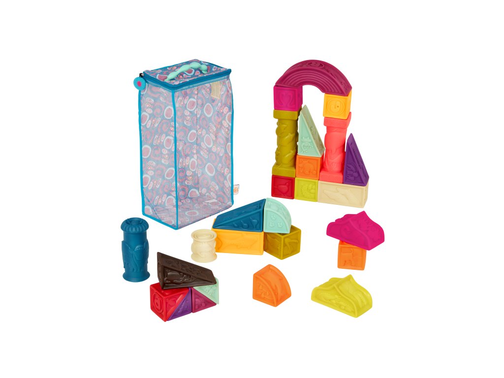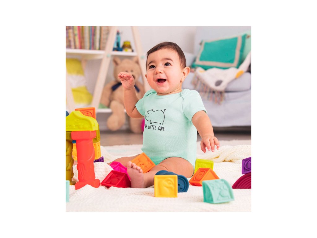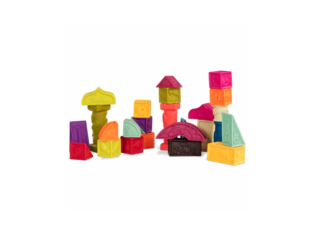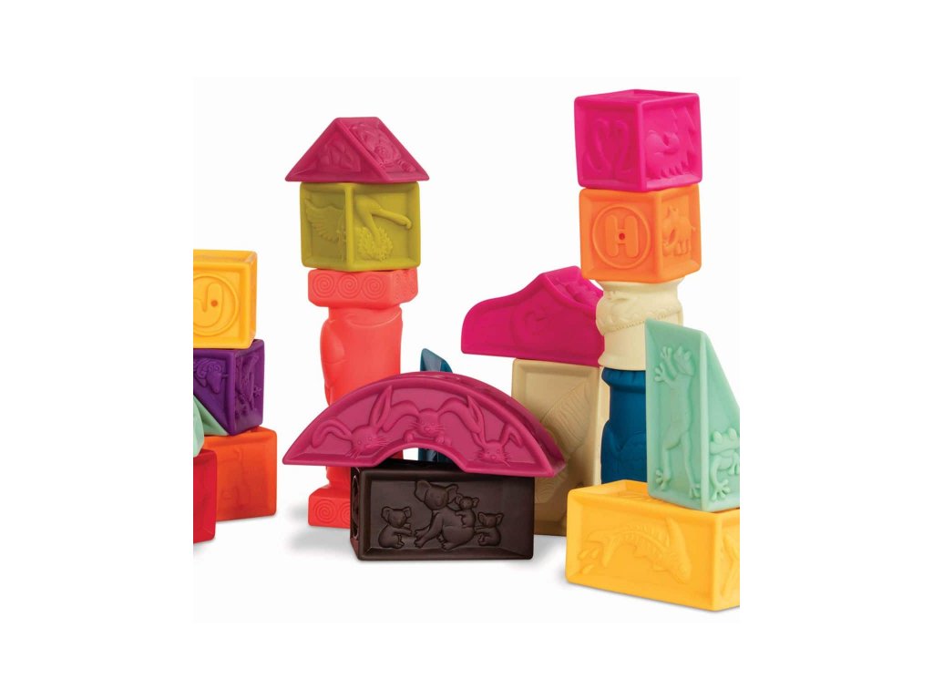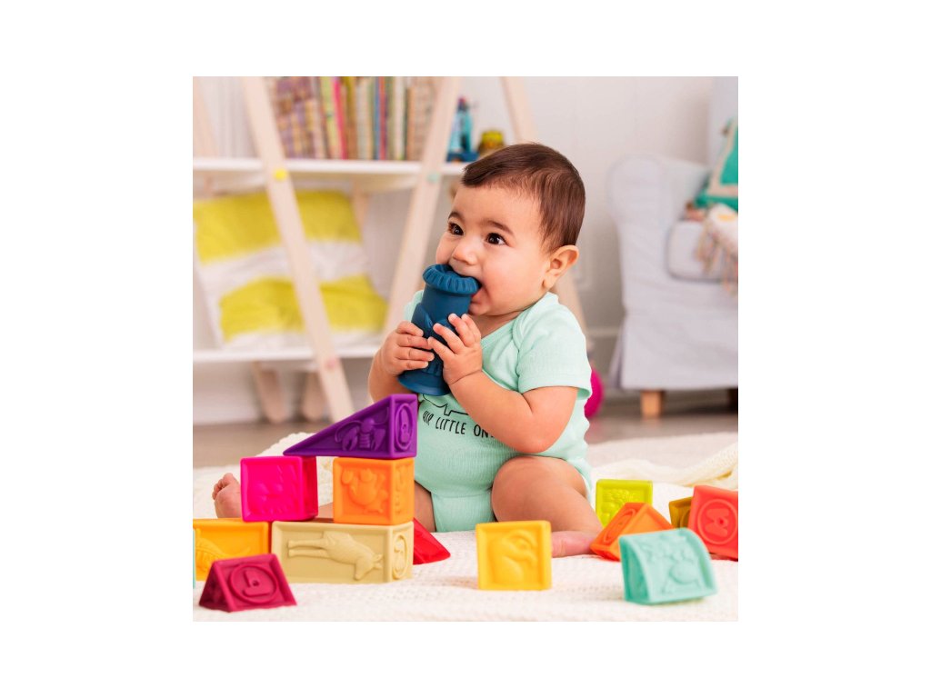 Sada 26 rôznofarebných kociek a tvarov s písmenami a zvieratami Elemenosqueeze od B.toys. Kocky sú vyrobené z mäkkého plastového materiálu a po stlačení pískajú. Rôznorodé textúry kociek lákajú na skúmanie rukami i ústami, neskôr si dieťa s kockami bude hádzať, stavať z nich, učiť sa písmenká a názvy zvieratiek.