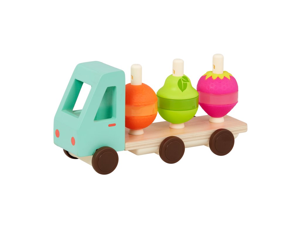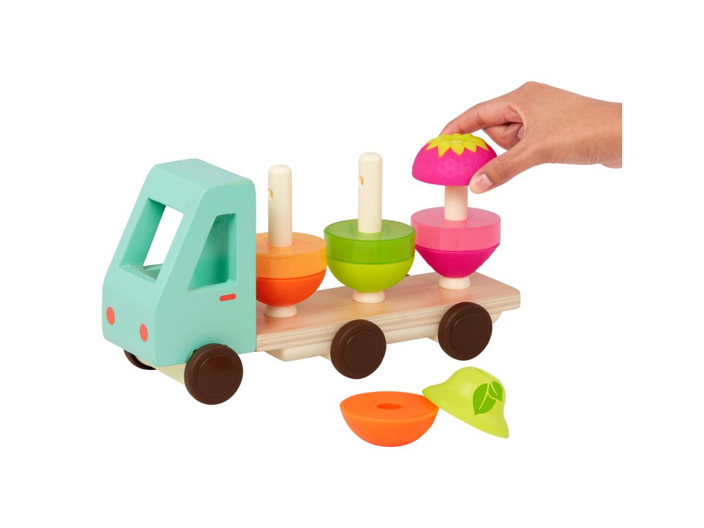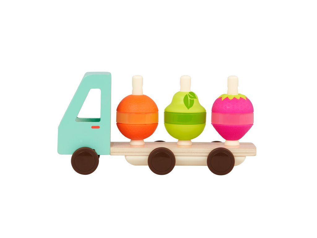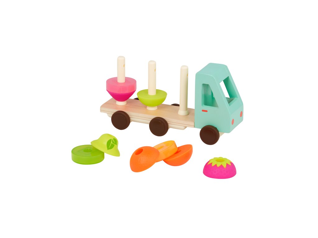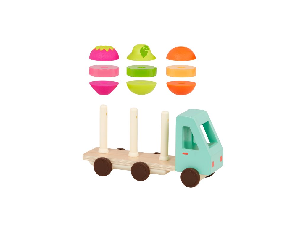 Nákladiak v krásnom drevenom prevedení vezie pomaranč, hrušku a jahodu, ktoré sa skladajú z 3 dielov. Dieťa ich skladá na seba podľa farby a tvaru.