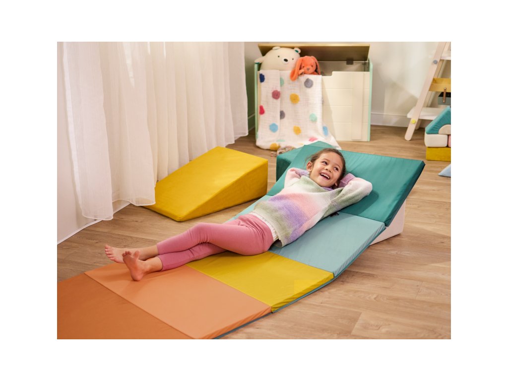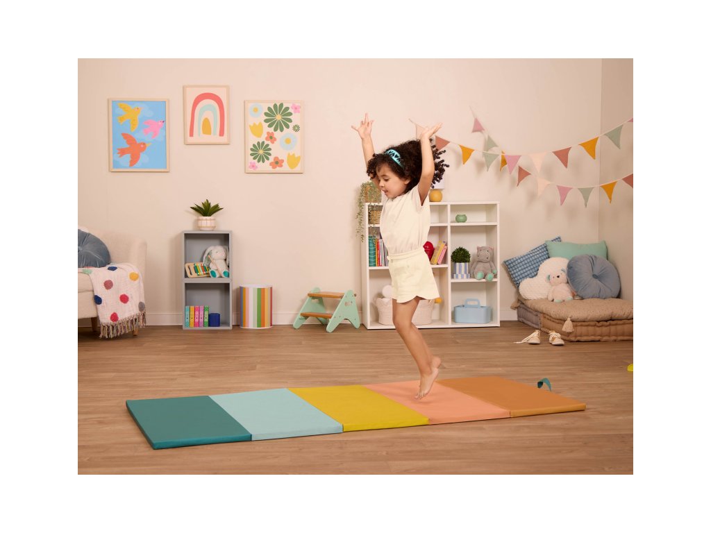 Farebná skladacia podložka WonderTumble je ideálna pre všetky aktívne deti, ktoré sa rady hýbu aj doma. Podložka je tvorená piatimi mäkkými penovými panelmi, ktoré sa ľahko rozložia do priestrannej podložky na skákanie, cvičenie, tancovanie a pod. Jemný mäkký povrch tlmí dopady a podporuje bezpečnejší pohyb pri hraní.