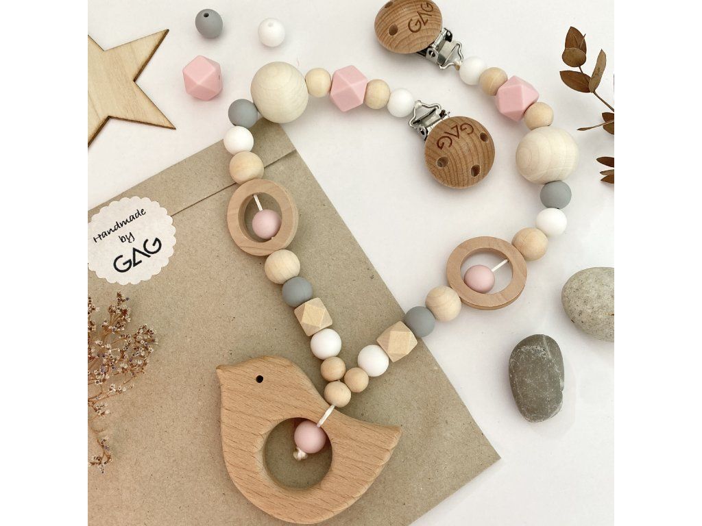 - Reťaz na kočík je vyrobená z prírodného dreva, silikónu vhodného na použitie v potravinách, nylonovej šnúry a kovových úchytov.