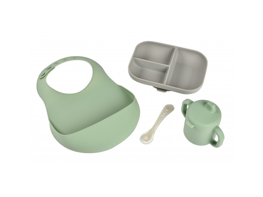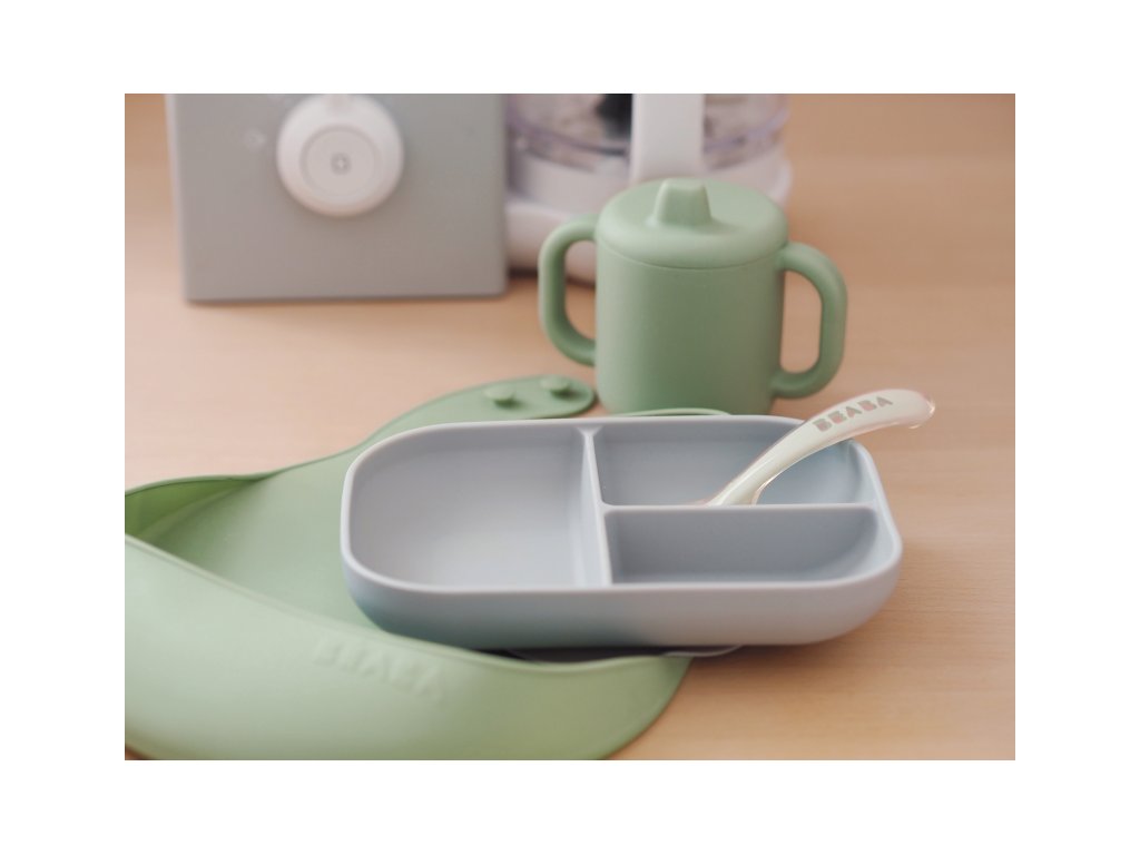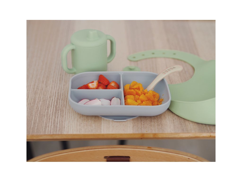 Sada silikónového deleného taniera s prísavkou, hrnčeka s náustkom a držadlami, podbradníka a lyžičky z vysoko kvalitného silikónu je ideálna pre prvé samostatné kŕmenie.