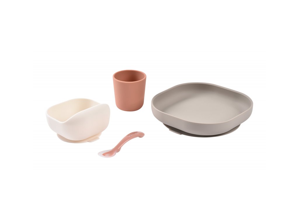 Sada taniera, misky, téglika na pitie a lyžičky z vysoko kvalitného silikónu je ideálna pre prvé samostatné kŕmenie. Prísavka pri miske a tanieri umožňuje uchytenie k stolu alebo pultu jedálenskej stoličky. Ergonomický tvar uľahčuje naberanie príkrmu.