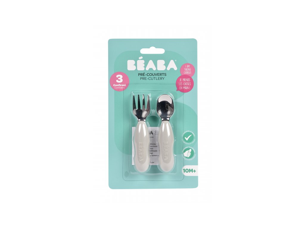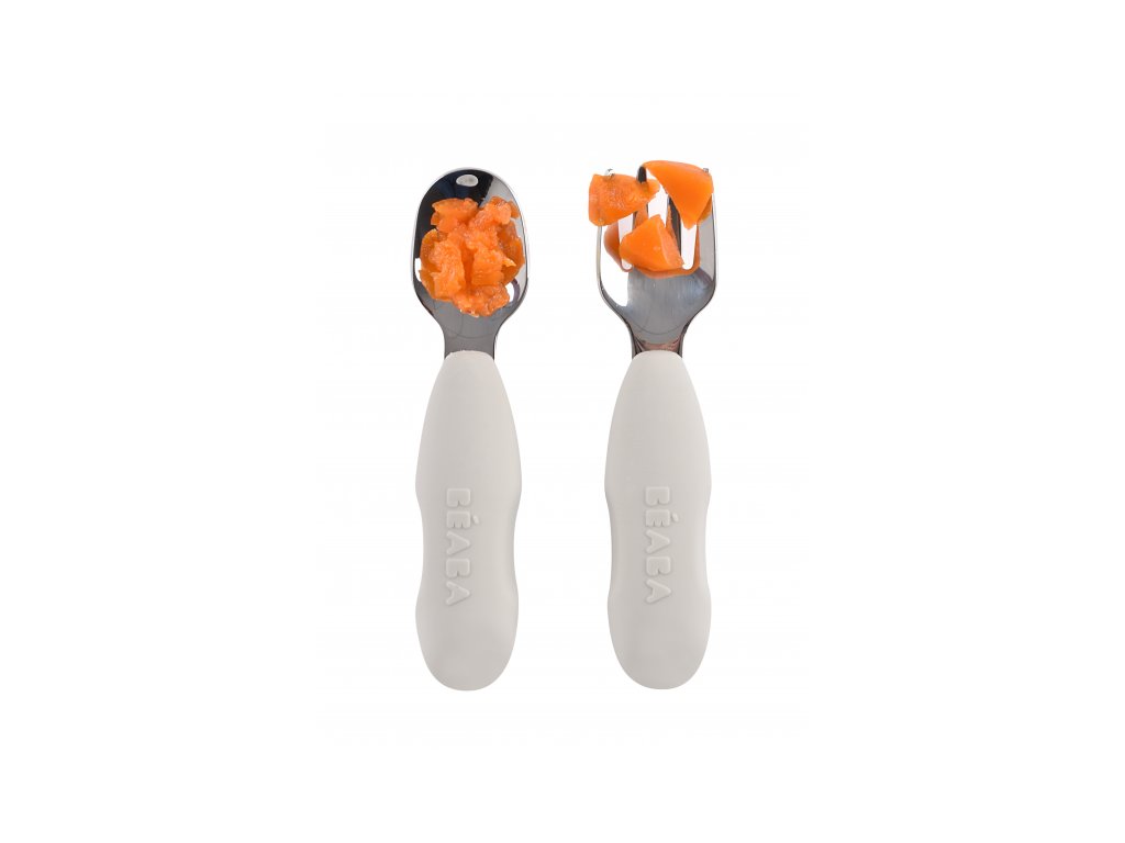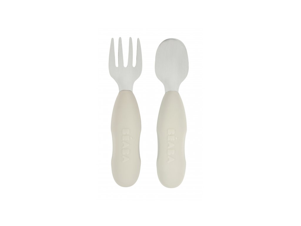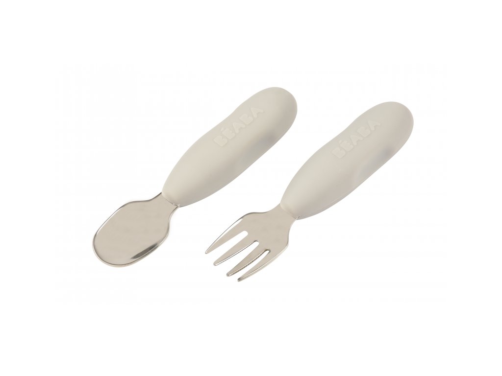 Prvý príbor z kvalitnej nerezovej ocele s plastovou rukoväťou uľahčí dieťaťu prechod od kŕmenia lyžičkou na používanie príboru. Nerezová vidlička a lyžička sú ľahké a vďaka ergonomickému plastovému držadlu ľahko uchopiteľné detskými rukami. Plytká lyžička je ideálna pre nabratie malého množstva príkrmu, ktoré dieťa dokáže doniesť až do úst. Zaguľatené hroty vidličky sú zárukou bezpečného používania.