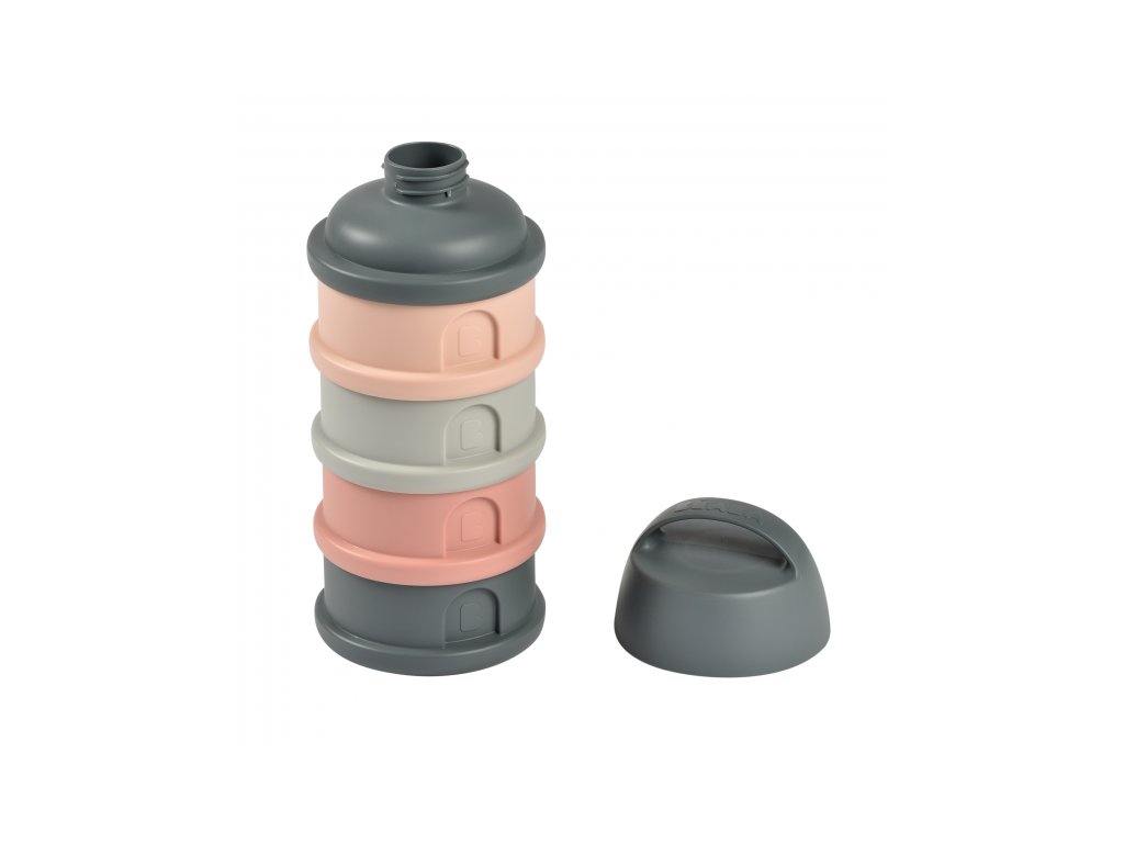 Tri kompaktné dávkovače sú prepojené skrutkovacím závitom, násypné viečko a ochranné viečko je taktiež skrutkovacie. Sušené mlieko je hygienicky uložené, stačí len nasypať s pomocou násypného viečka do akejkoľvek dojčenskej fľaše bez rizika rozsypania.