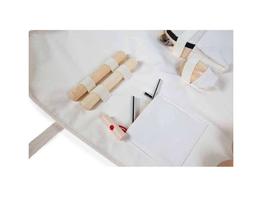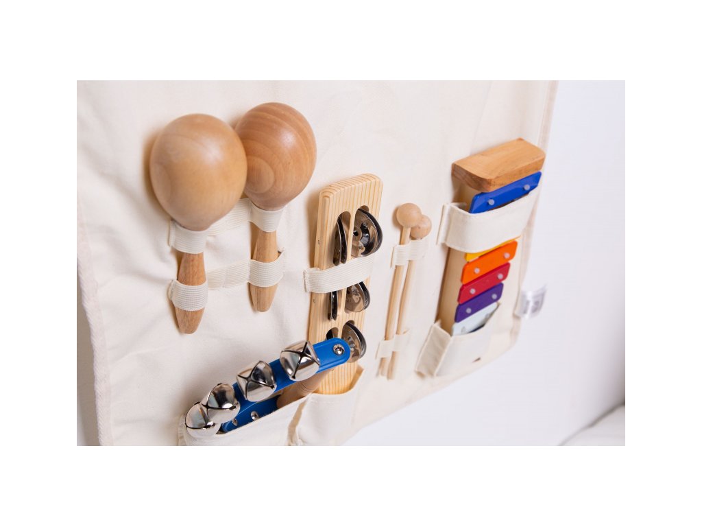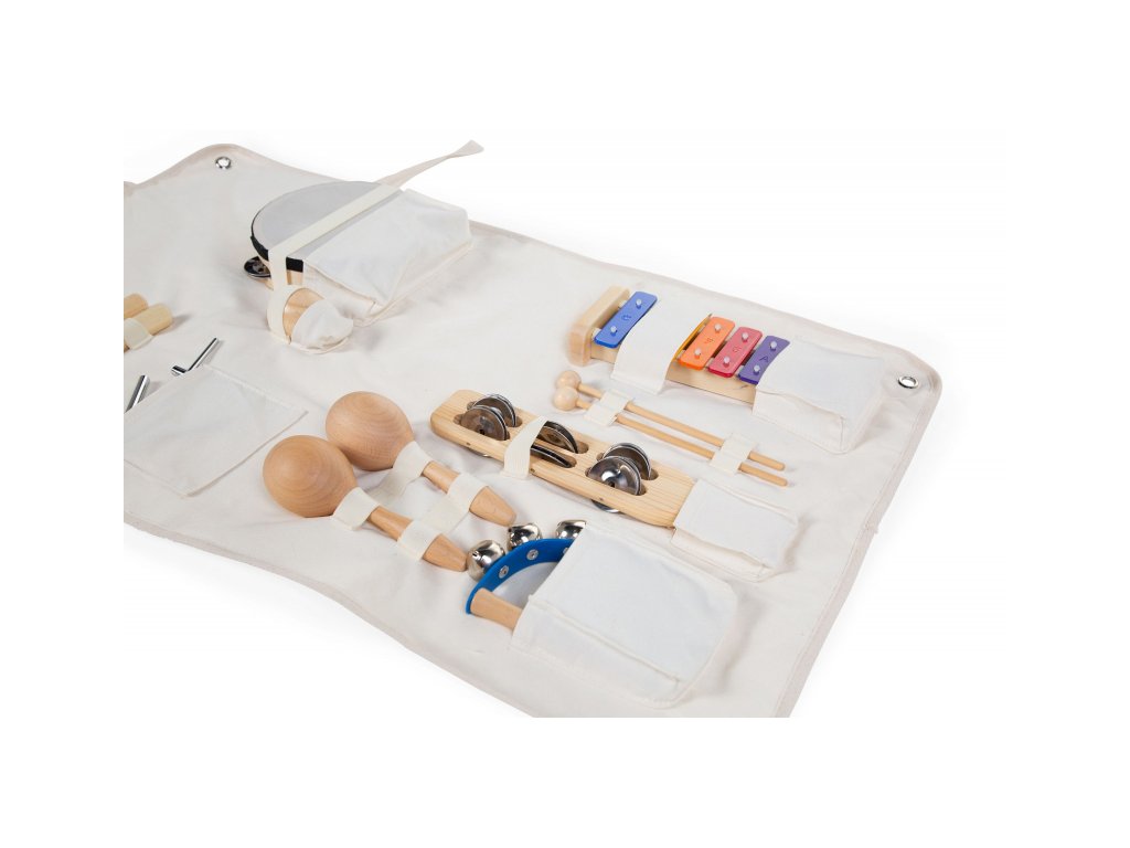Sada detských hudobných nástrojov v praktickom textilnom organizéri umožní najmenším hudobníkom zoznámiť sa s hudobnou improvizáciou a zaistí im nekonečnú zábavu.