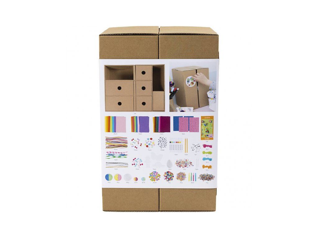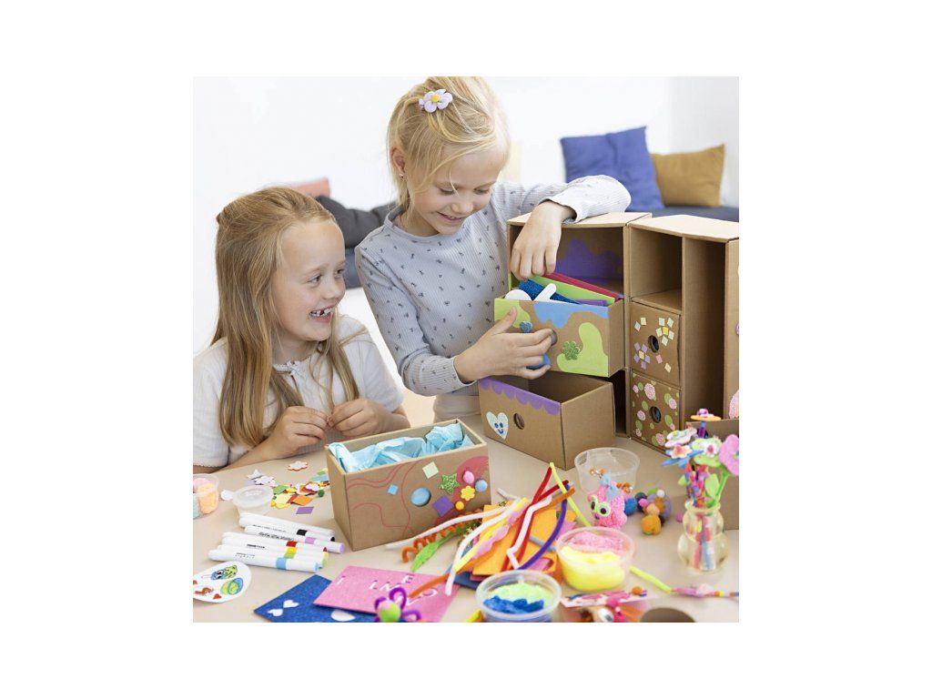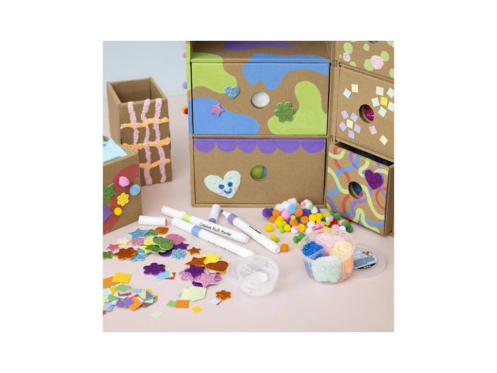 Maxi kreatívna súprava v boxe so zásuvkami je plná materiálov pre kreatívne tvorenie. Súprava ponúka množstvo inšpirácie a nekonečné možnosti tvorenia – od roztomilých dekorácií až po bláznivé postavičky a originálne výtvory.