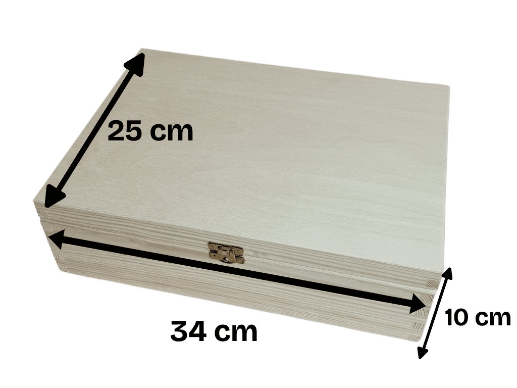 Drevený box veľkosti M (Stredný) má vonkajšie rozmery 34x25x10 cm.