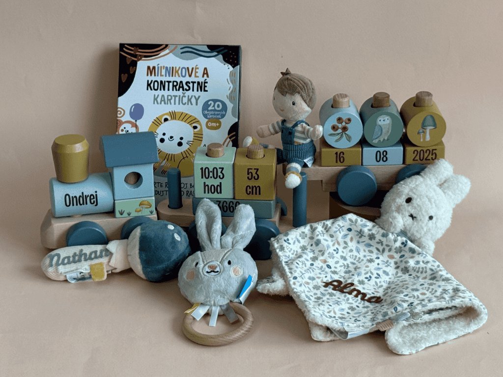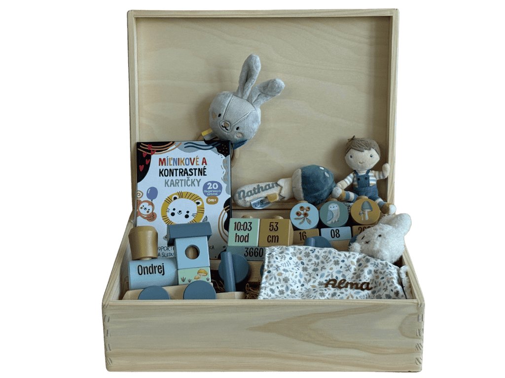 Sada je krásne zabalená vo veľkom drevenom boxe s personalizovaným gravírovaním mana, čo z nej robí naozaj výnimočný darček na pamiatku. Obsahuje všetko, čo malé bábätko poteší aj využije – od rozkošného dreveného vláčika s motívom lesných zvieratiek, cez hrkálku, míľnikové kartičky až po mäkučkého mojkáčika. Všetko je ladené do jemnej pastelovo modrej farby a pôsobí veľmi harmonicky.