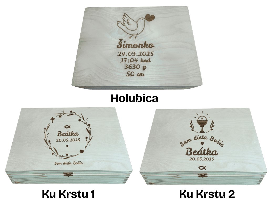 - Osobný dotyk: Vďaka gravírovaniu sa z boxu stane jedinečná pamiatka pre celú rodinu – zadáš meno, dátum alebo odkaz, ostatné vybavíme za teba.