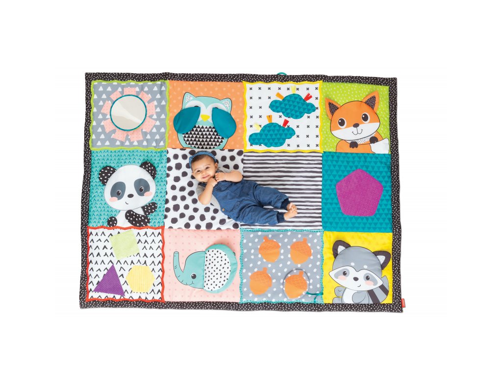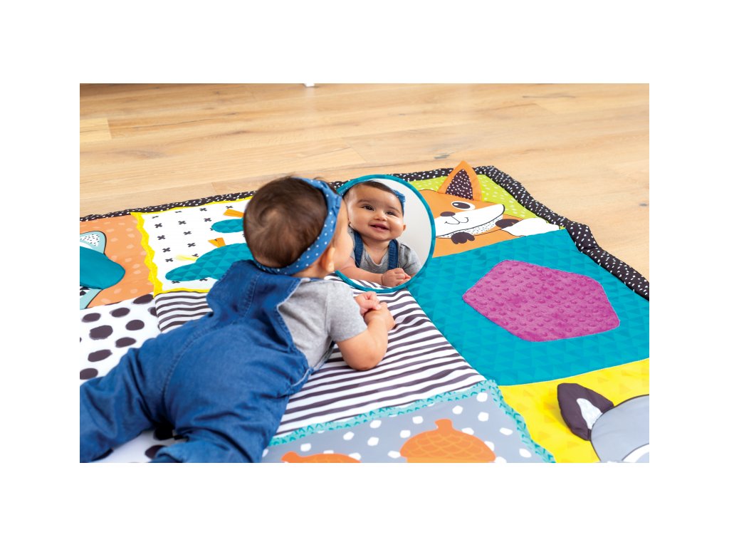 Extra veľká mäkká hracia deka poskytne vášmu dieťaťu dostatok priestoru i pohodlia pre hranie na zemi. Vysoko kontrastné obrázky aj bezpečné zrkadielko stimulujú zrak dieťaťa, rôznorodé textúry lákajú na skúmanie a podporujú tak rozvoj hmatu dieťaťa. Usmievavé obrázky zvieratiek pomáhajú rozvíjať emočnú inteligenciu dieťaťa. Zrkadlo je možné postaviť pred dieťa pre podporu hrania v polohe na brušku, ktorá je dôležitá pre rozvoj svalov dieťaťa.