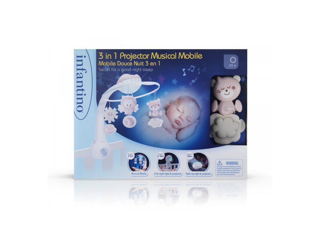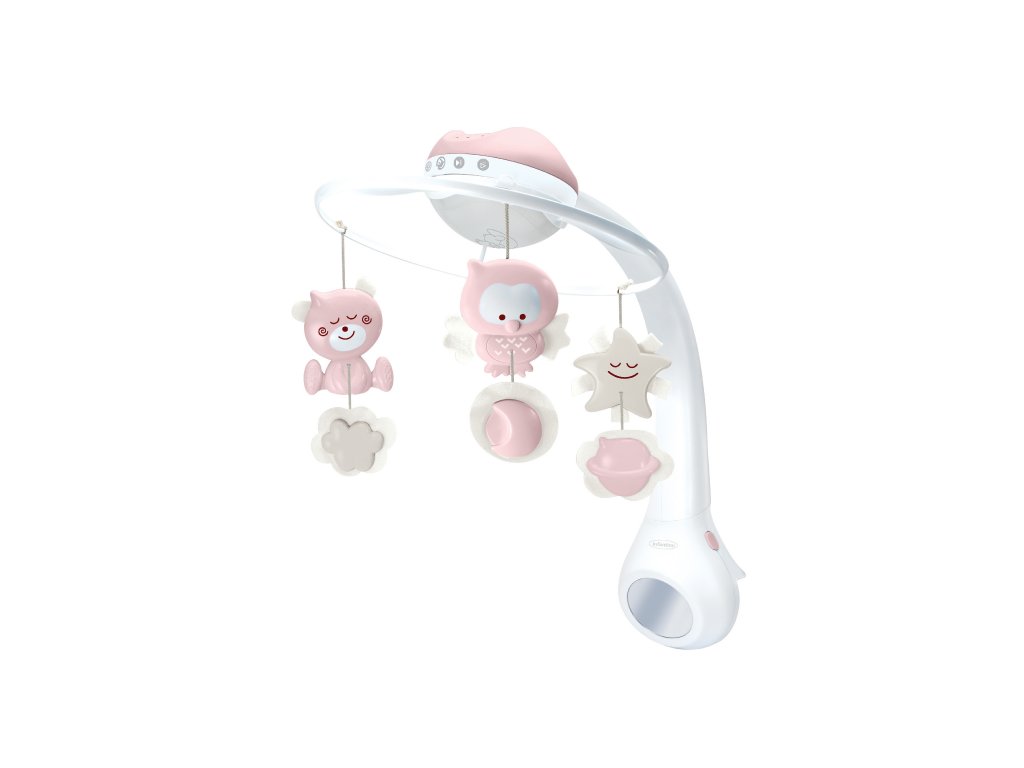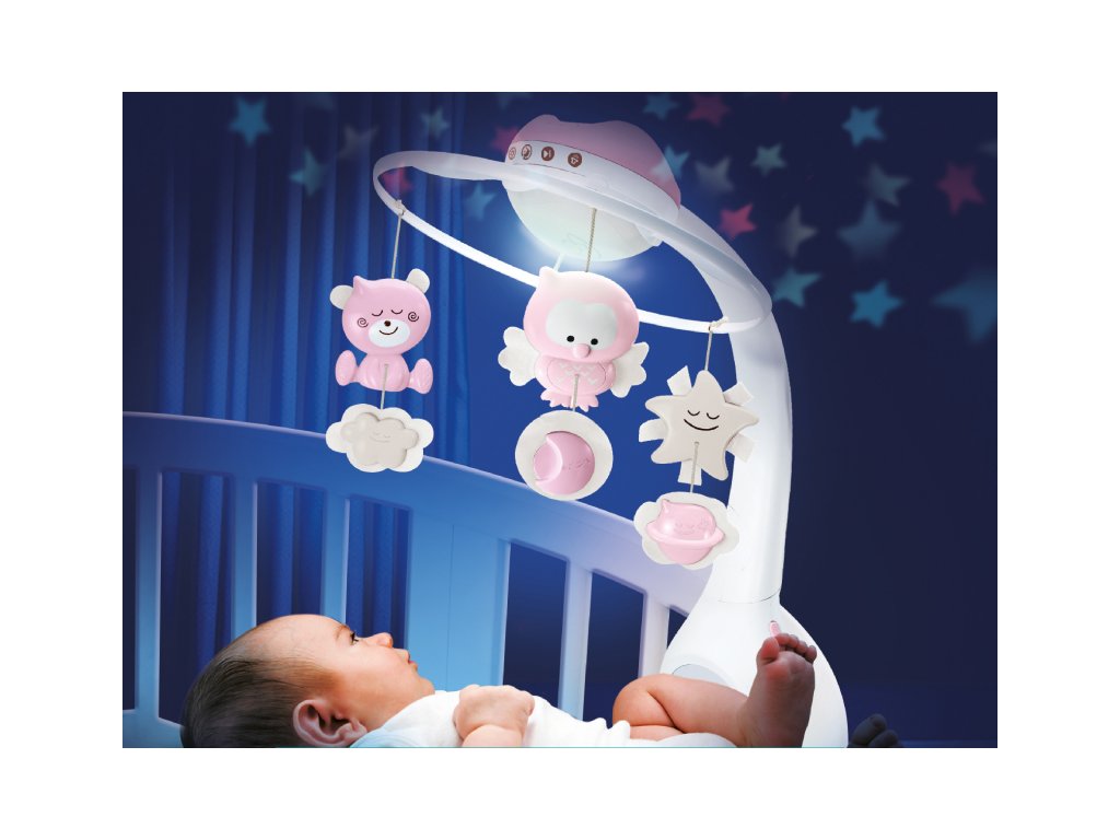 Hudební kolotoč se světelným projektorem pro snadné usínání i zabavení dítěte. Světelný projektor promítá na stěnu či strop hvězdičky a jemně tak osvítí dětský pokoj. Spolu s uklidňující melodií pomůže vašemu dítěti v klidu usínat. Nabízí na výběr z 10 uklidňujících melodií a zvuků přírody. Melodie a přírodní zvuky kolotoč po zapnutí přehrává 20 minut. Kolotoč s projektorem nabízí 3 možnosti použití: