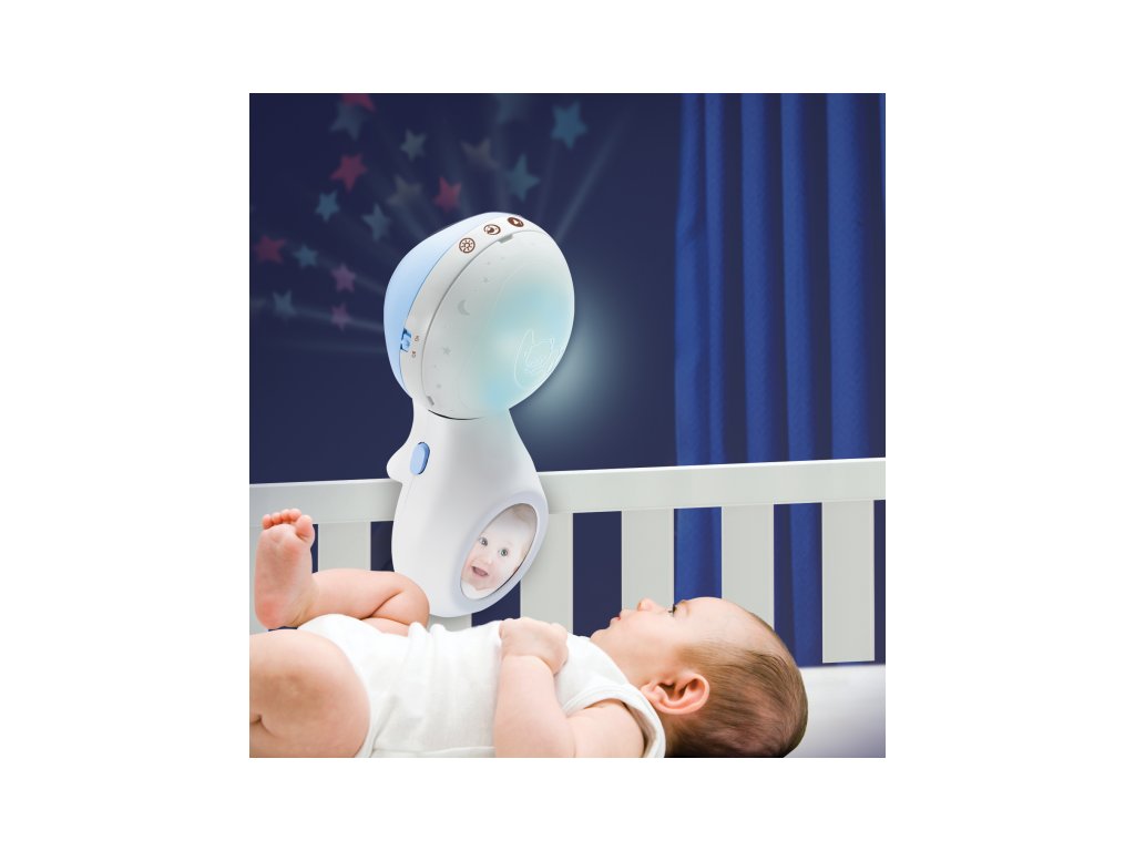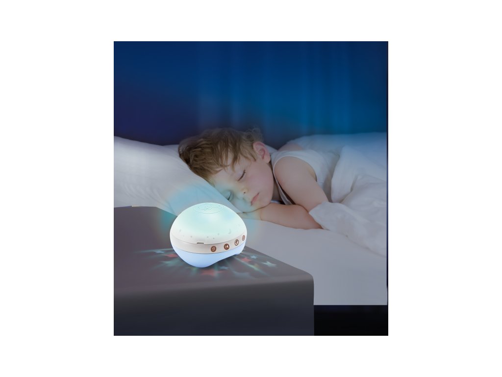 Svetelný projektor premieta na stenu či strop hviezdičky a jemne tak osvieti detskú izbu. Spolu s upokojujúcou melódiou pomôže vášmu dieťaťu v pokoji zaspávať.