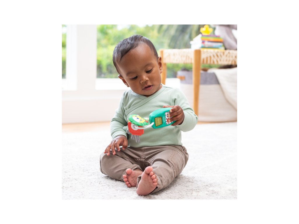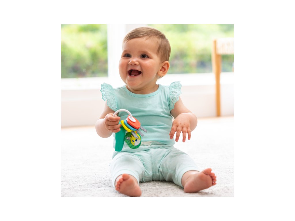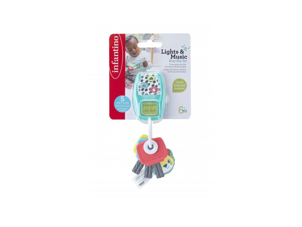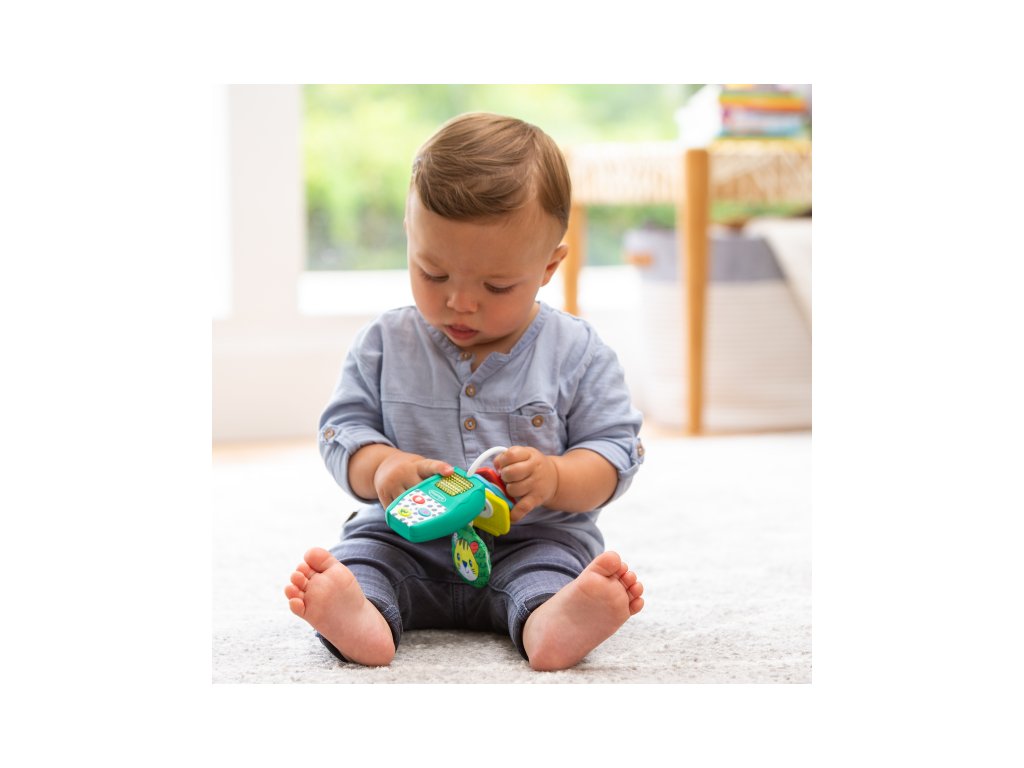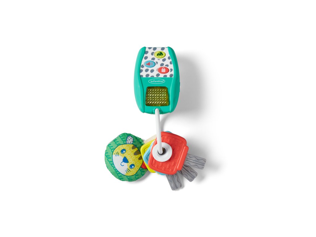 Farebné kľúče z príjemného materiálu s ovládačom, ktorý po stlačení svieti a hrá päť melódií a zvukov.