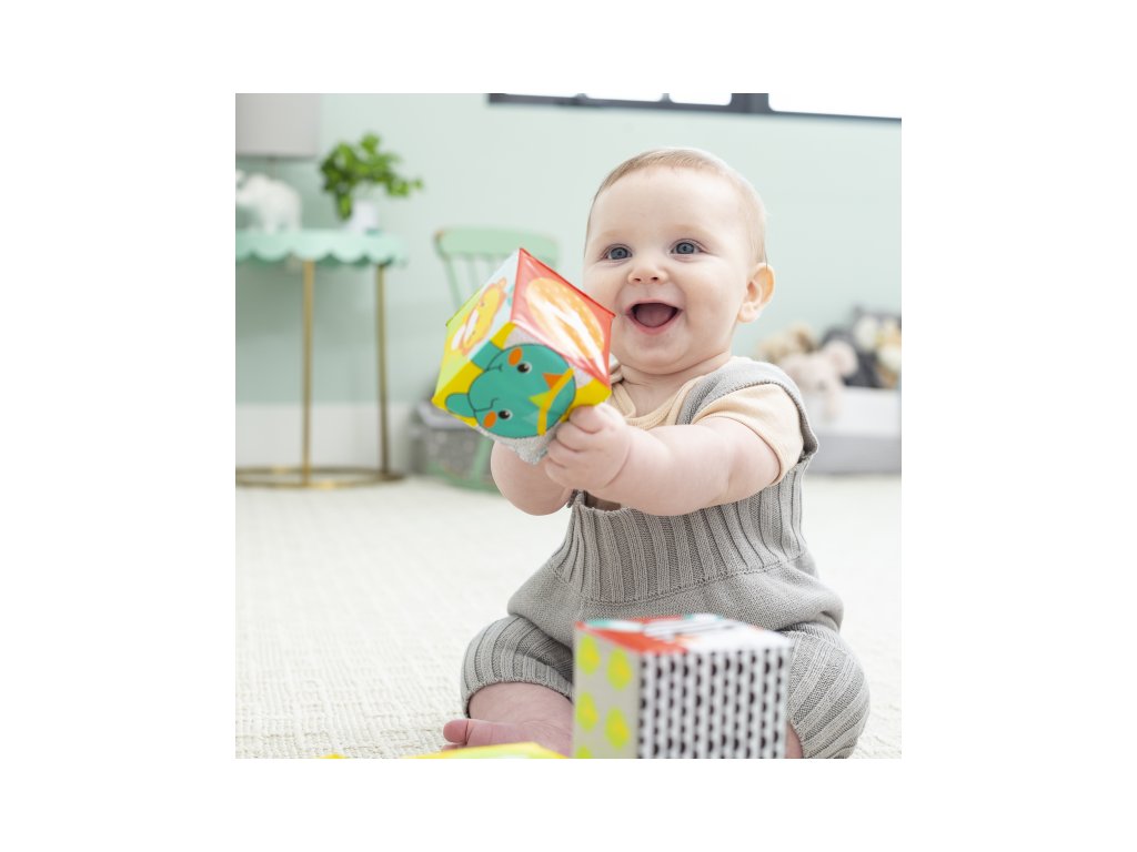 Omyvatelné kostky s krásnými ilustracemi zvířátek ve výrazných kontrastních barvách jsou vhodné pro použití ve vaně i jako první kostky pro stavění věží a společné vyprávění o zvířátkách, barvách i číslech.