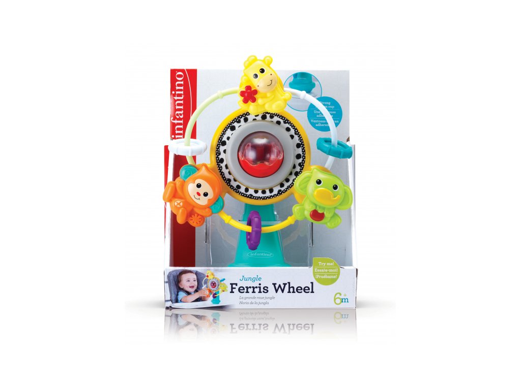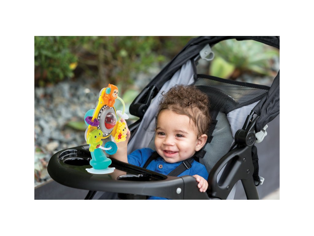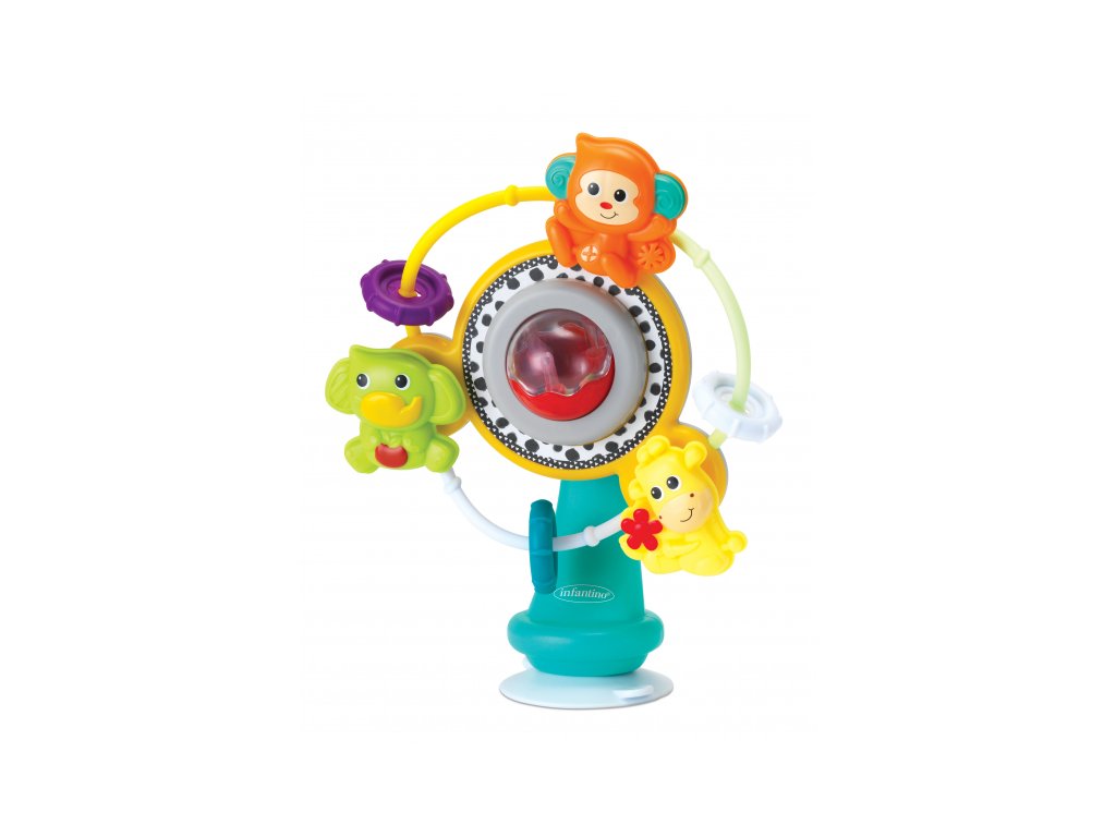Kolotoč s prísavkou môžete pripevniť napríklad na pultík jedálenskej stoličky. Kolotoč aj jednotlivé zvieratká sa dajú roztočiť. Pri roztočení kolotoč aj korálky v priehľadnej loptičke hrkajú.