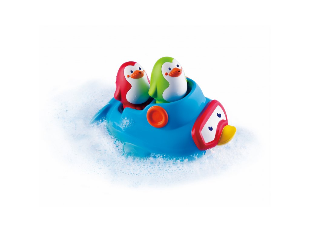 Loďka v podobe maxi tučniaka, ktorý vozí dva malé striekacie tučniaky, je originálna a zábavná hračka do kúpeľa. Vymýšľajte spolu s dieťaťom počas kúpania príbehy o tom, čo všetko tučniaky na svojich výletoch prežívajú a užívajte si spoločne príjemné chvíle pred spaním.