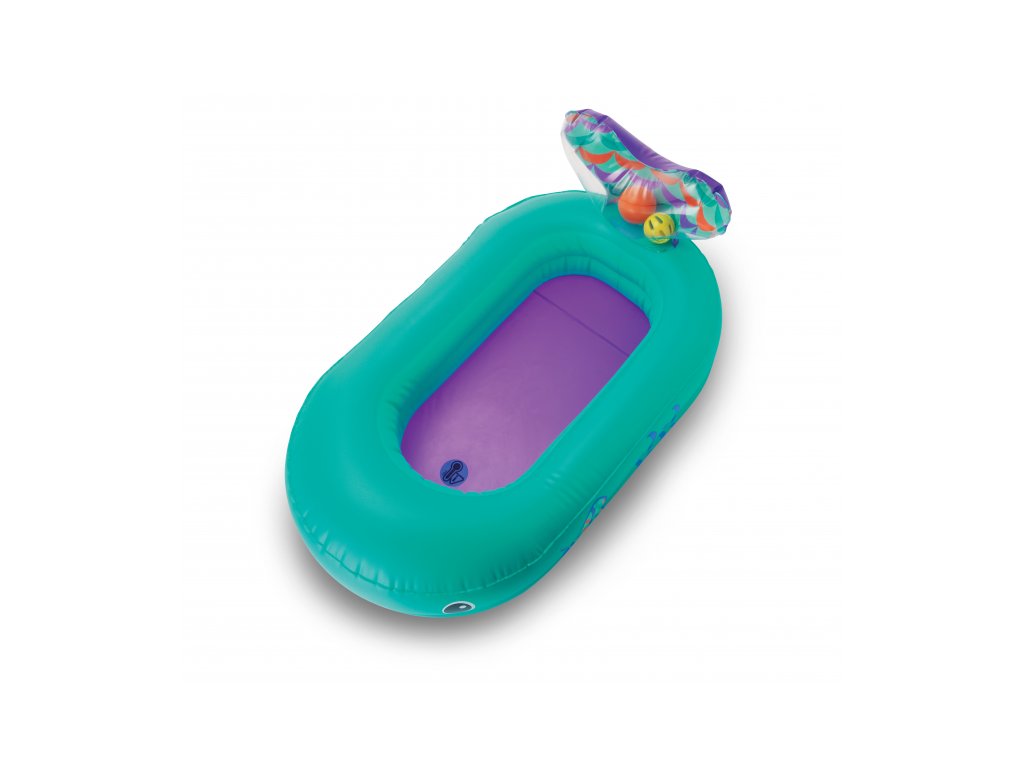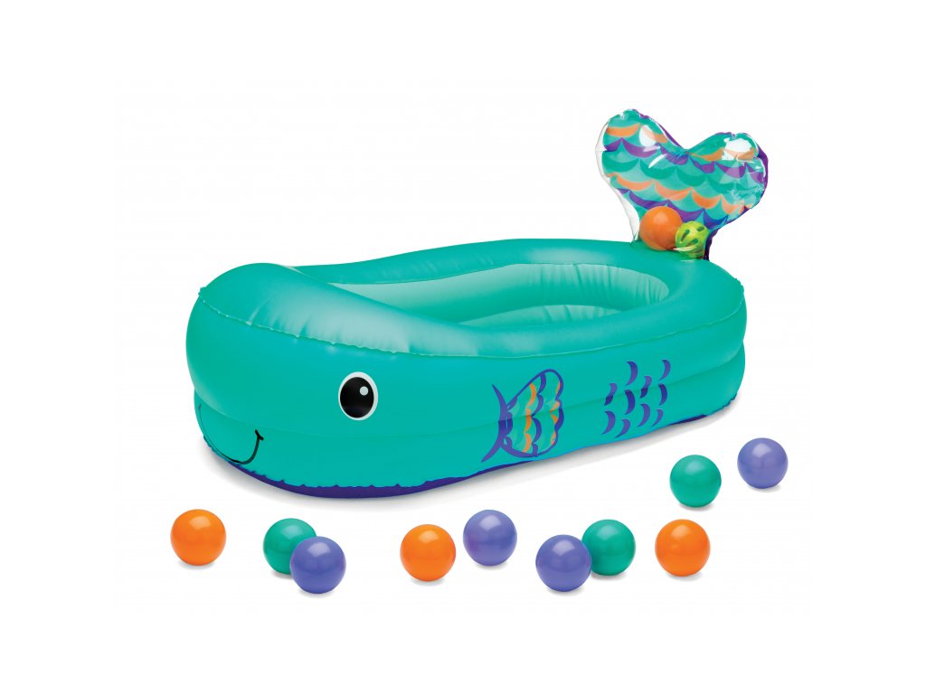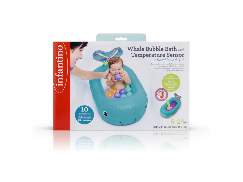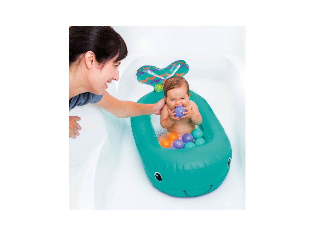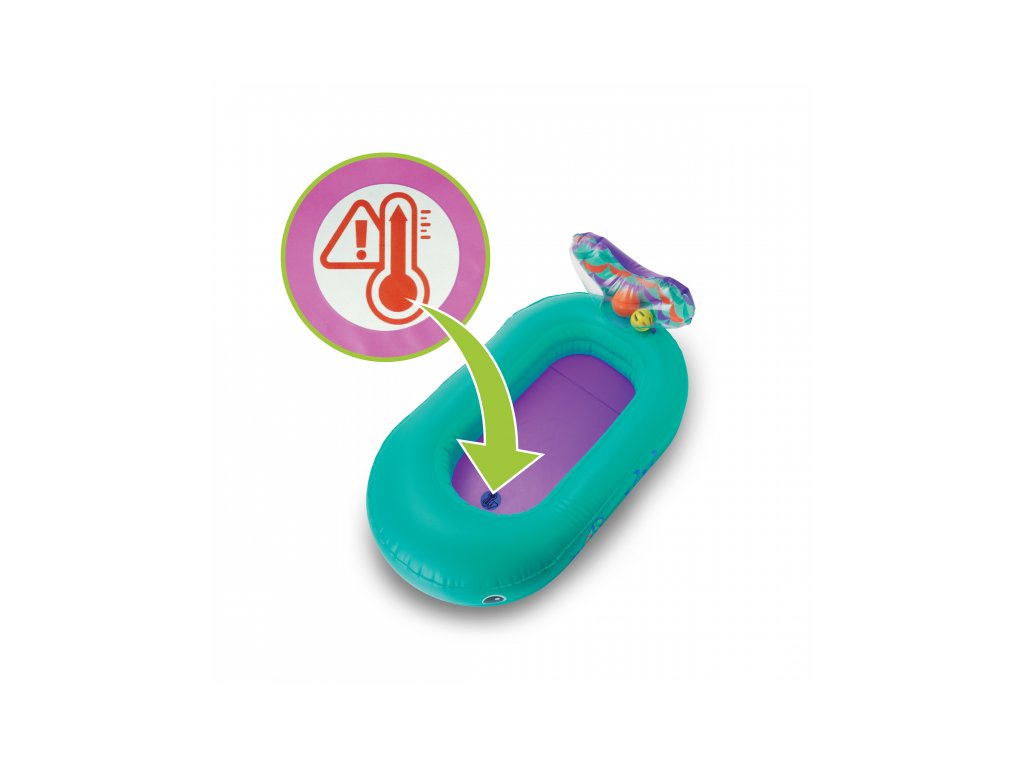 Nafukovací vaničku v podobě velryby využijete doma i na cestách. Teplotní senzor ve vaničce vám pomůže hlídat optimální teplotu pro koupání, která by měla být v rozmezí 32,2°C a 37,8°C. Při tomto optimálním rozmezí teploty vody se senzor zabarví.