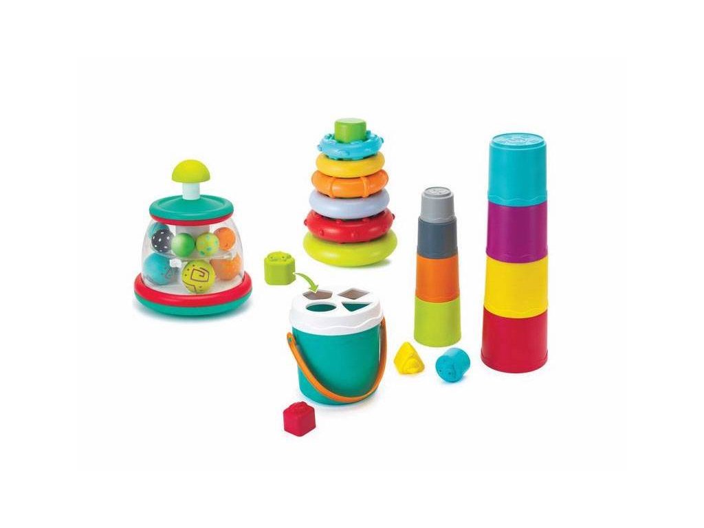 - Stohovacie kelímky v vedierku - osem farebných stohovacích kelímkov, ktoré môžete stavať až do výšky 70 cm alebo naopak vkladať do seba + vedierko s vekom, v ktorom sú otvory štyroch rôznych tvarov, do nich pasujú štyri farebné kocky. Stohovacie kelímky spolu s kockami ľahko zložíte do vedierka, ktoré je opatrené praktickým držadlom.