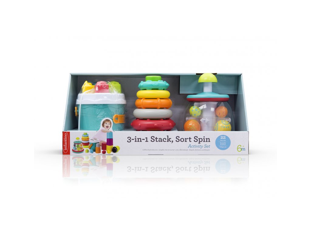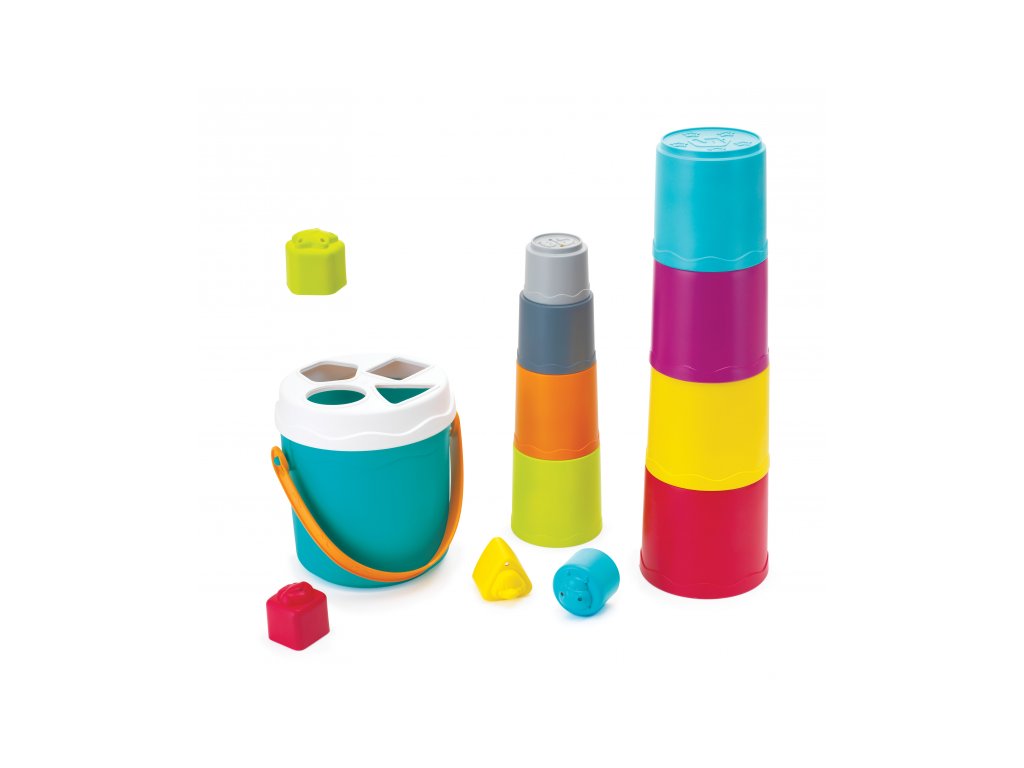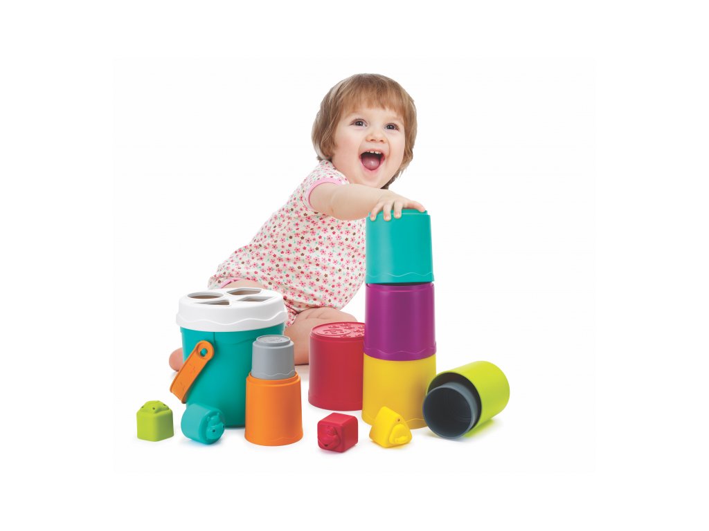 - Stohovacie kelímky v vedierku - osem farebných stohovacích kelímkov, ktoré môžete stavať až do výšky 70 cm alebo naopak vkladať do seba + vedierko s vekom, v ktorom sú otvory štyroch rôznych tvarov, do nich pasujú štyri farebné kocky. Stohovacie kelímky spolu s kockami ľahko zložíte do vedierka, ktoré je opatrené praktickým držadlom.