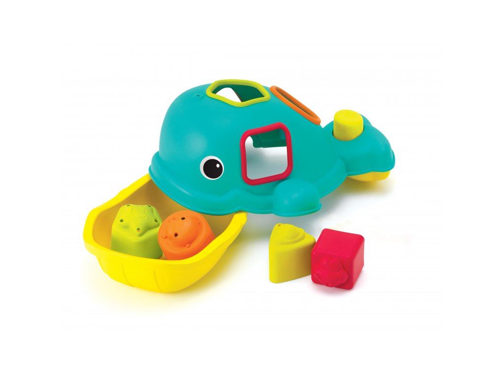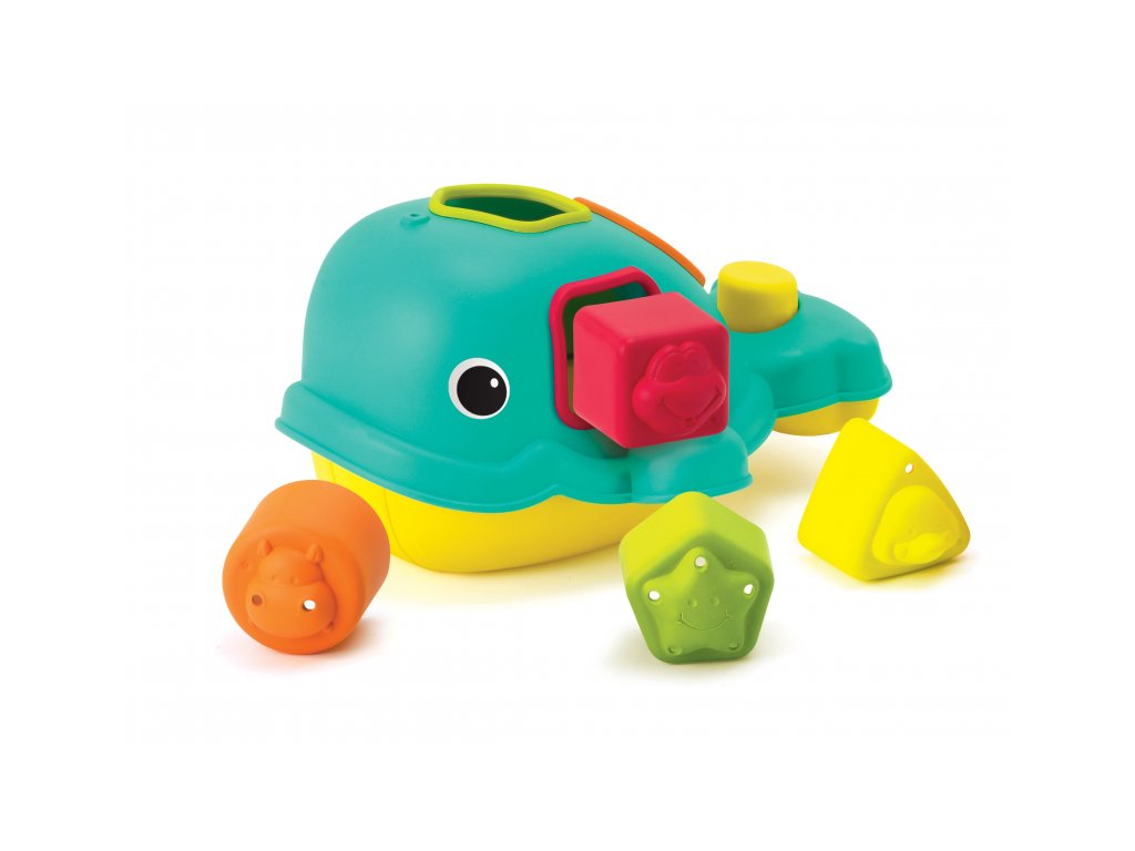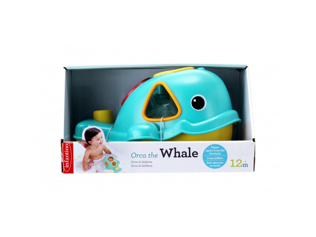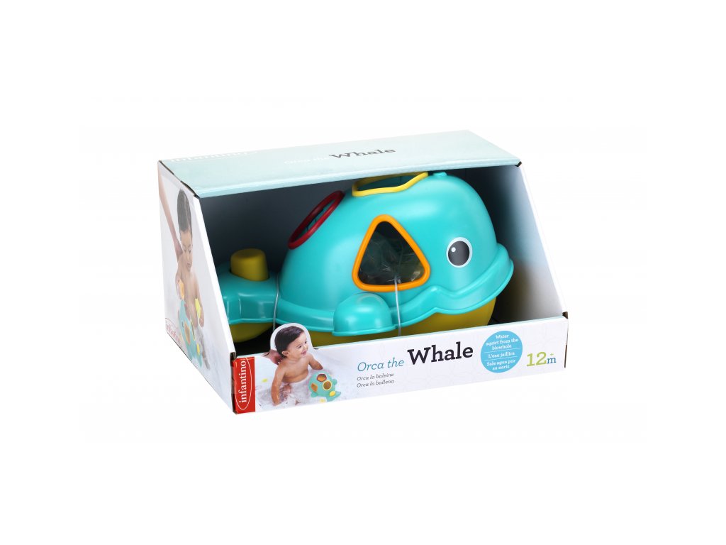 Veľryba pre hru vo vani počas kúpania pláva na hladine a po stlačení tlačidla na chvoste strieka vodu. Kelímky rôznych tvarov cedia vodu a pasujú do jednotlivých otvorov vo veľrybe.