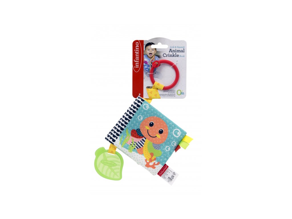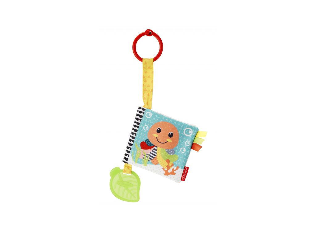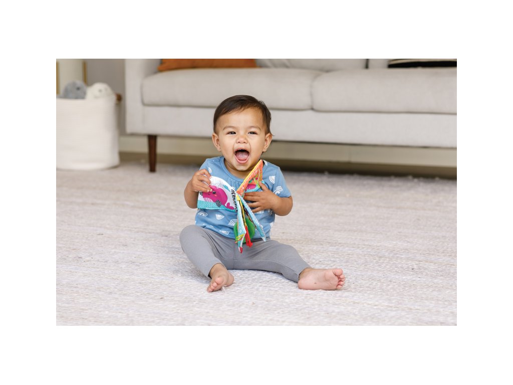 Textilná knižka s výraznými obrázkami zvieratiek vo vysoko kontrastných farbách pomáha rozvíjať zrak dieťaťa a ponúka dieťaťu rôznorodé textúry na skúmanie. Jednotlivé stránky pri stlačení šuštia či pískajú, súčasťou je aj hryzátko v podobe lístka, ktoré pomôže dieťaťu pri prerezávaní prvých zúbkov. Krúžok umožňuje zavesenie na kočík alebo autosedačku.