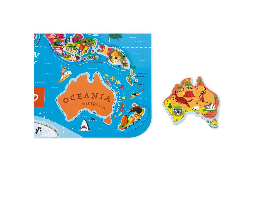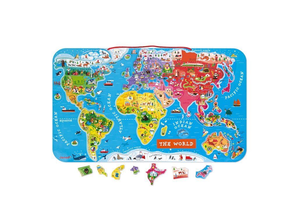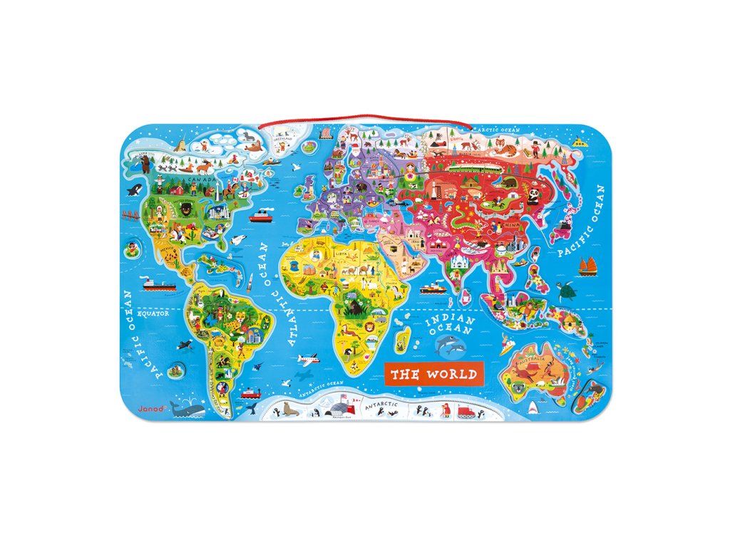 Ví vaše dítě, kde leží Madagaskar? Na kterých penguinech žijí póly? Kde a kde vede transibrinová dálnice? Kde jsi byl minulý rok na dovolené? Chcete, aby byly další geografické koncepty navždy zapamatovány? Získejte mu velkou mapu světa se spoustou zajímavých detailů a naučte ho geografií hravým způsobem! Krásná magnetická mapa světa obsahuje 92 dřevěných kusů hádanky, kde každá z nich představuje region nebo zemi, nese název hlavního města a obsahuje obrázek charakterizující místo (významné budovy, památky, zvířata a rostliny z Oblast). Mapa je v angličtině. Mapa může být zavěšena na zdi, což z ní činí mimořádný doplněk do školky. Hračka vhodná od 5 let Rozměry mapy jsou 77 x 46 x 1 cmDodatočné parametre