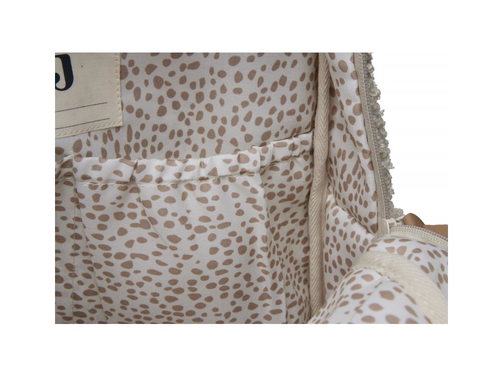 Prebaľovací batoh z príjemnej buklé textílie s podšívkou je určený pre pohodlné nosenie všetkého potrebného na prechádzkach a výletoch s vašim dieťaťom. Hlavný priestor s uzatváraním na zips má vo vnútri oddelenú priehradku a vrecko na zips na uloženie drobností, ďalšie vrecko na zips je na prednej strane batohu. Dve vonkajšie vrecká po stranách sú ideálne na ukladanie nápojov. Nastaviteľné ramenné popruhy umožňujú pohodlné nosenie na chrbte aj zavesenie na rukoväť kočíka. Vďaka pútku sa ľahko nosia aj v ruke. Súčasťou plecniaka je praktická prebaľovacia podložka.