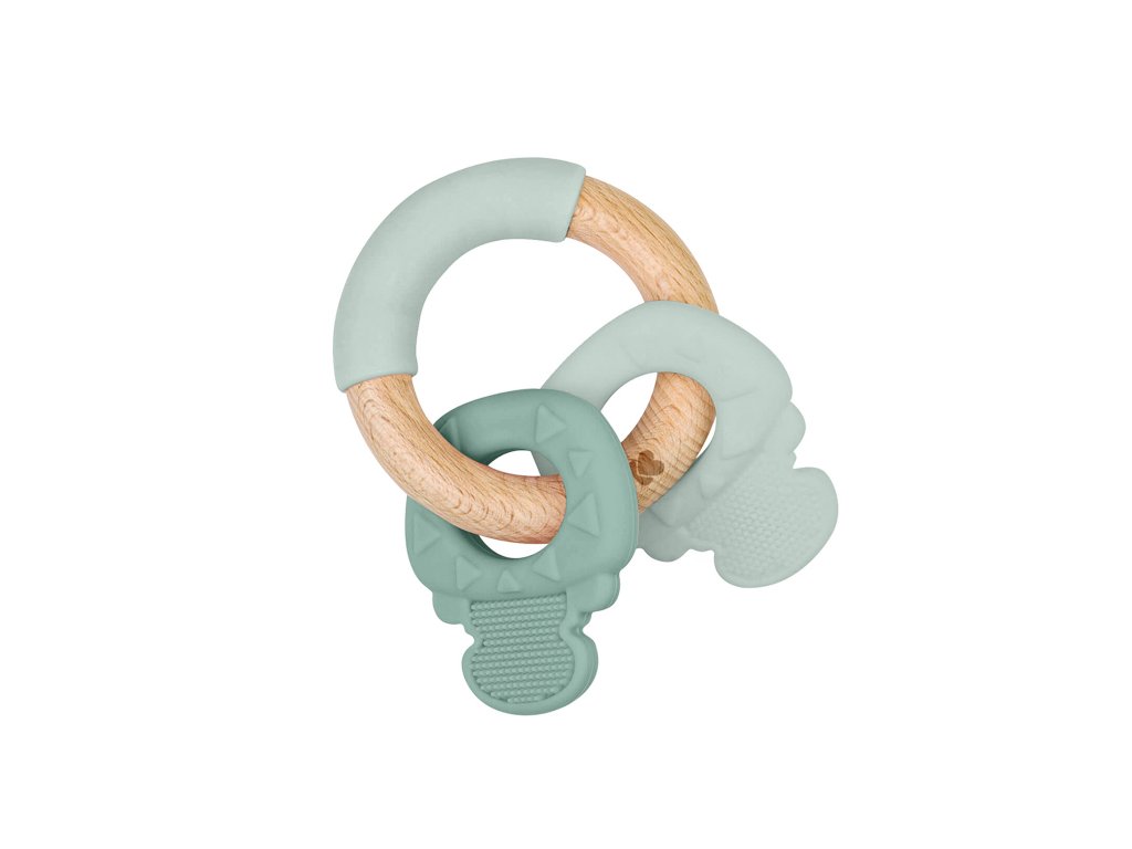 Hryzátko KikkaBoo v podobe krúžku s kľúčmi je vyrobené z bezpečného, jemného silikónu a bukového dreva. Rôznorodé textúry hryzátka lákajú dieťa na skúmanie v ústach a pomáhajú pri prerezávaní jeho prvých zúbkov. Tvar hryzátka umožňuje jeho ľahké uchopenie malými detskými ručičkami.