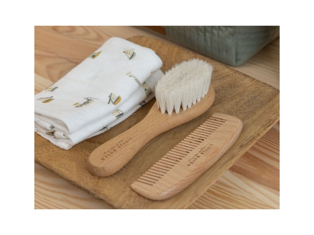 Sada na každodennú starostlivosť o detské vlásky obsahuje drevenú kefu s mäkkými štetinami a hrebeň so širokými zubami, ktoré sú šetrné k citlivej pokožke hlavy bábätka.