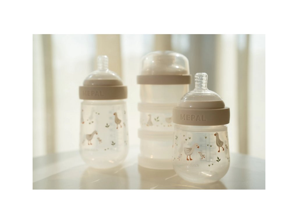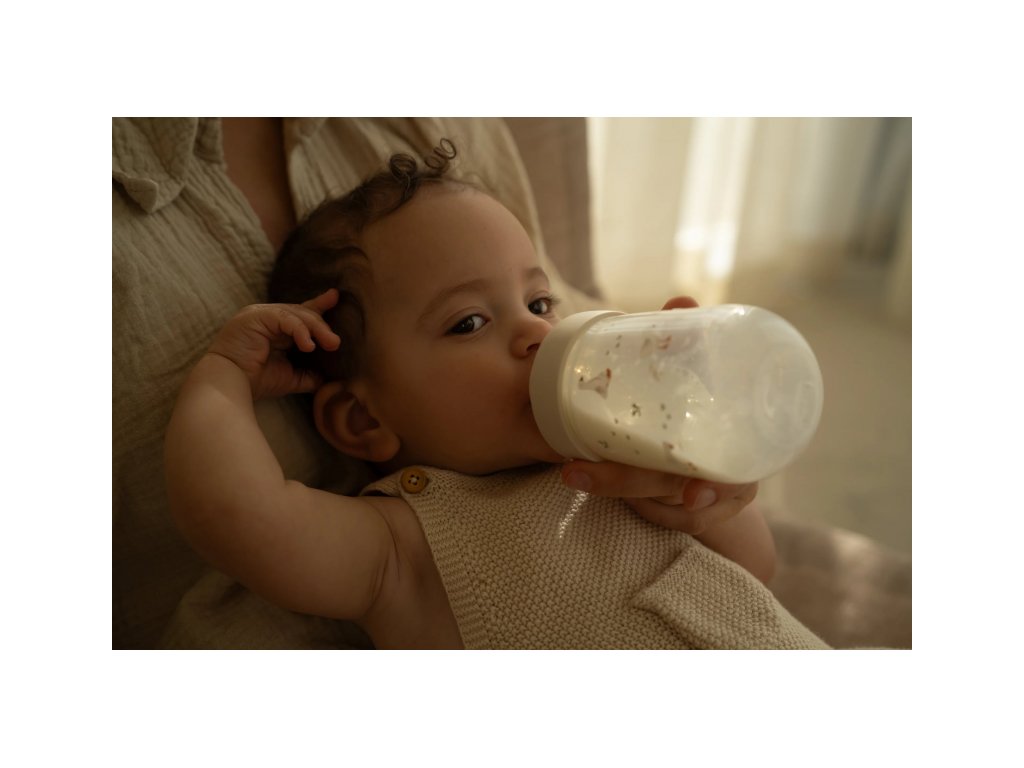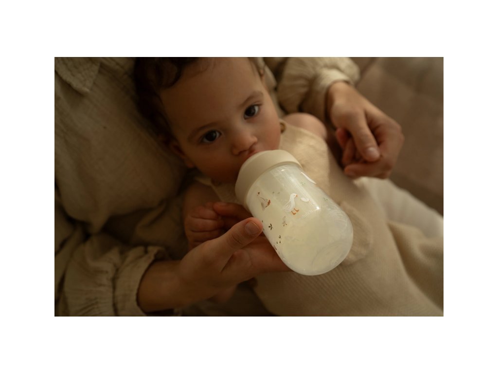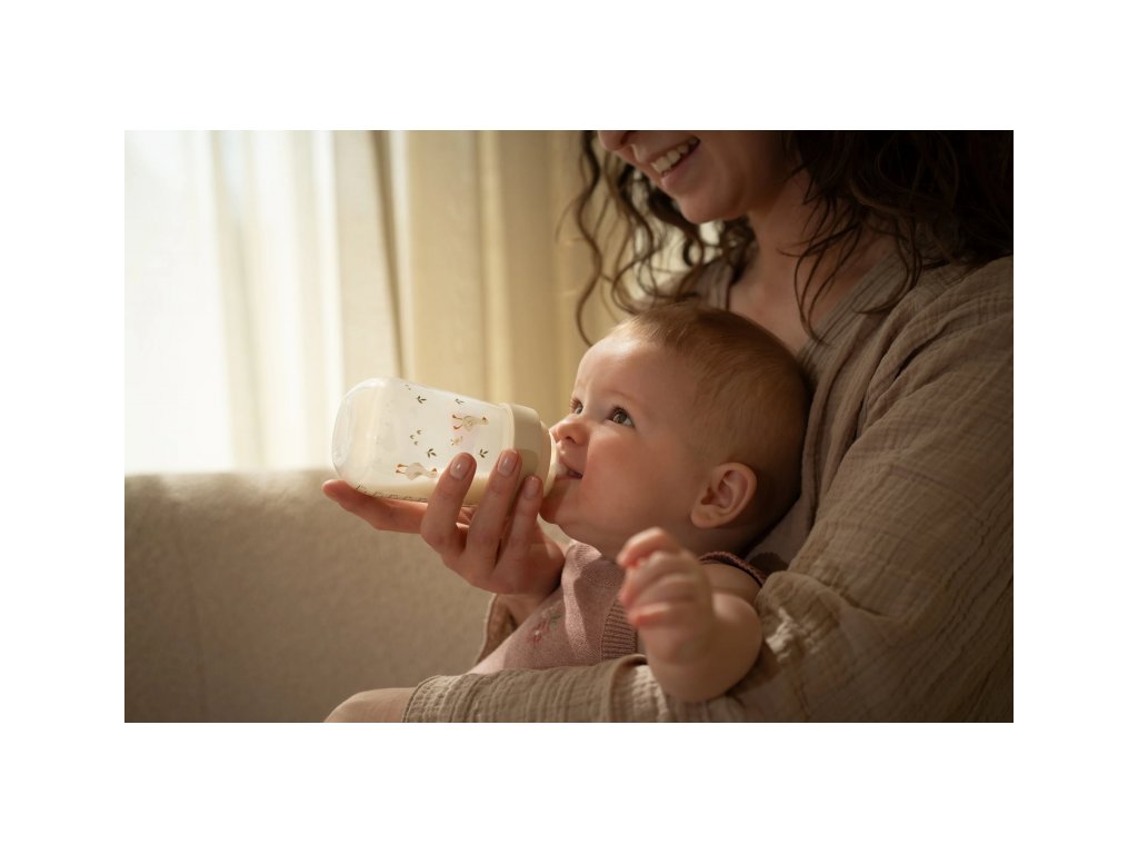 Sada dojčenských fliaš Little Dutch s krásnou potlačou a cumlíkom s antikolikovým ventilom obsahuje dve fľaše (165 ml a 240 ml) so cumlíkom s pomalým prietokom, vhodné pre deti od narodenia, a dva cumlíky so stredným prietokom, vhodné pre deti od 3 mesiacov.