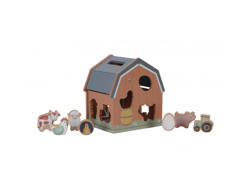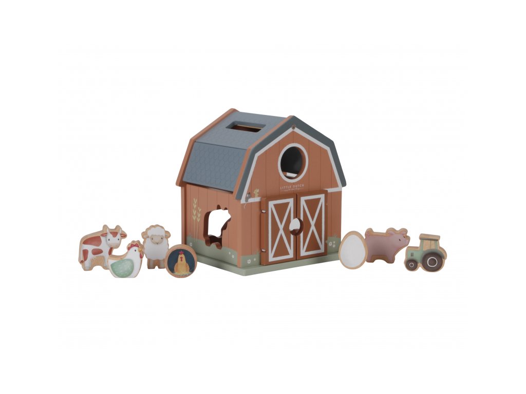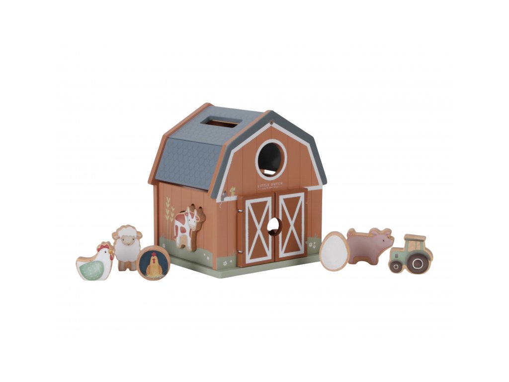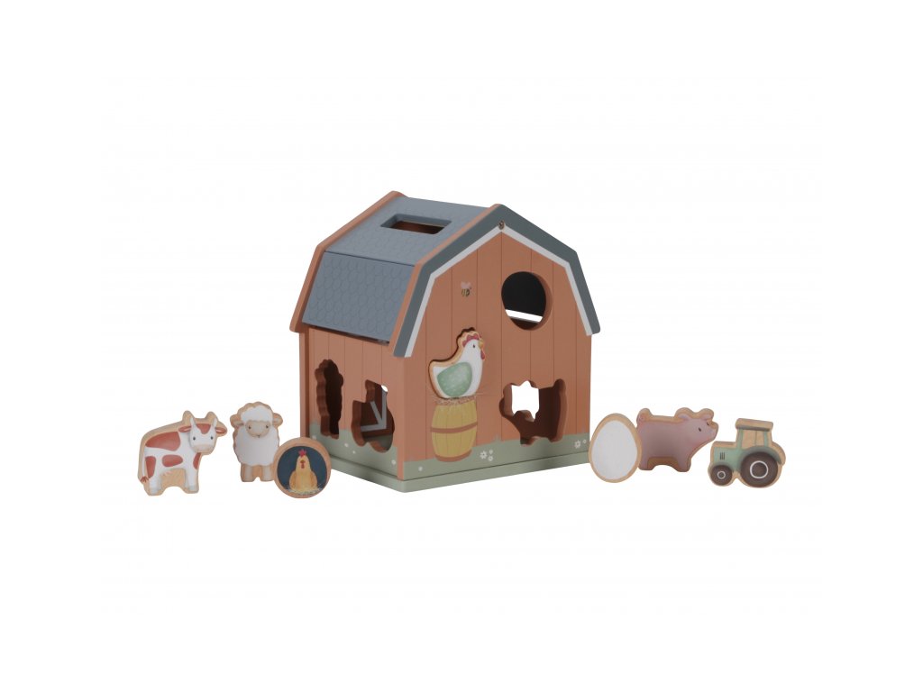 Drevený domček v podobe stodoly pre zvieratká učí deti kreatívnym spôsobom rozpoznávať tvary a zdokonaliť svoju koordináciu rúk a očí. Malé ručičky ľahko uchopia figúrky rôznych tvarov a potom ich zatlačia do správneho otvoru.