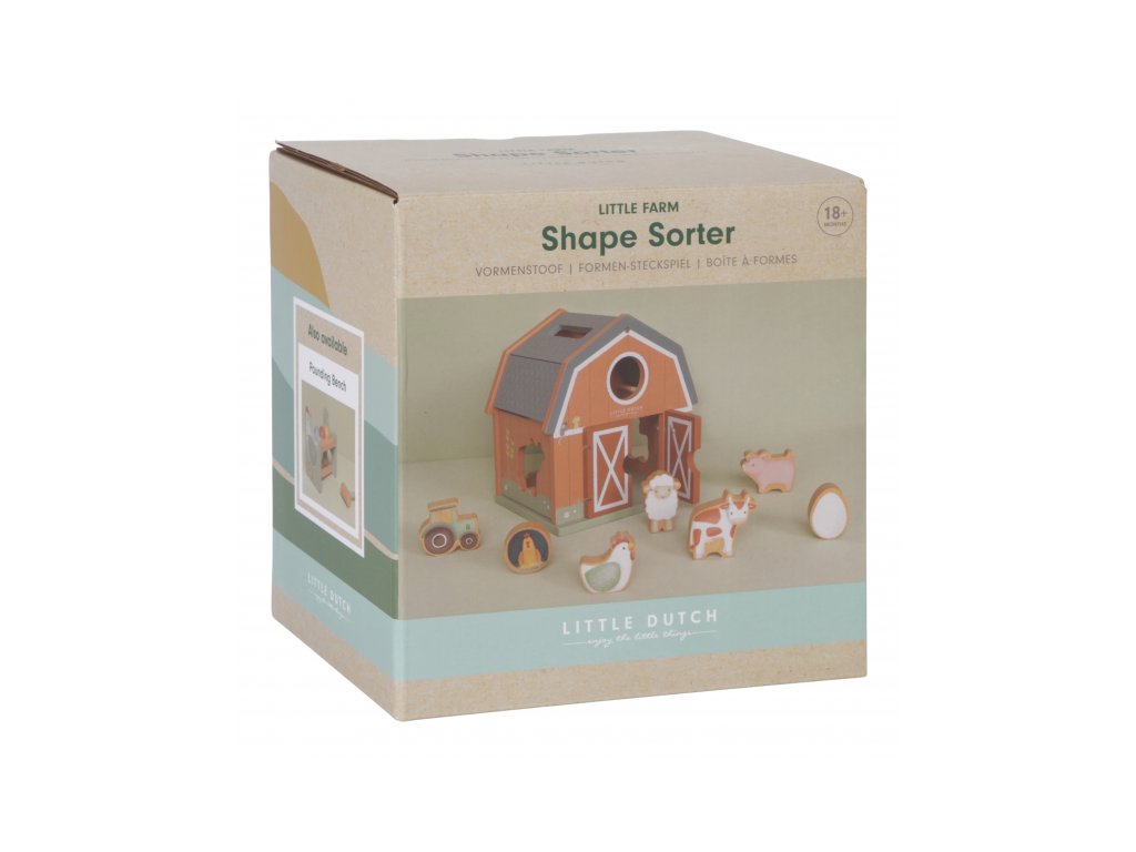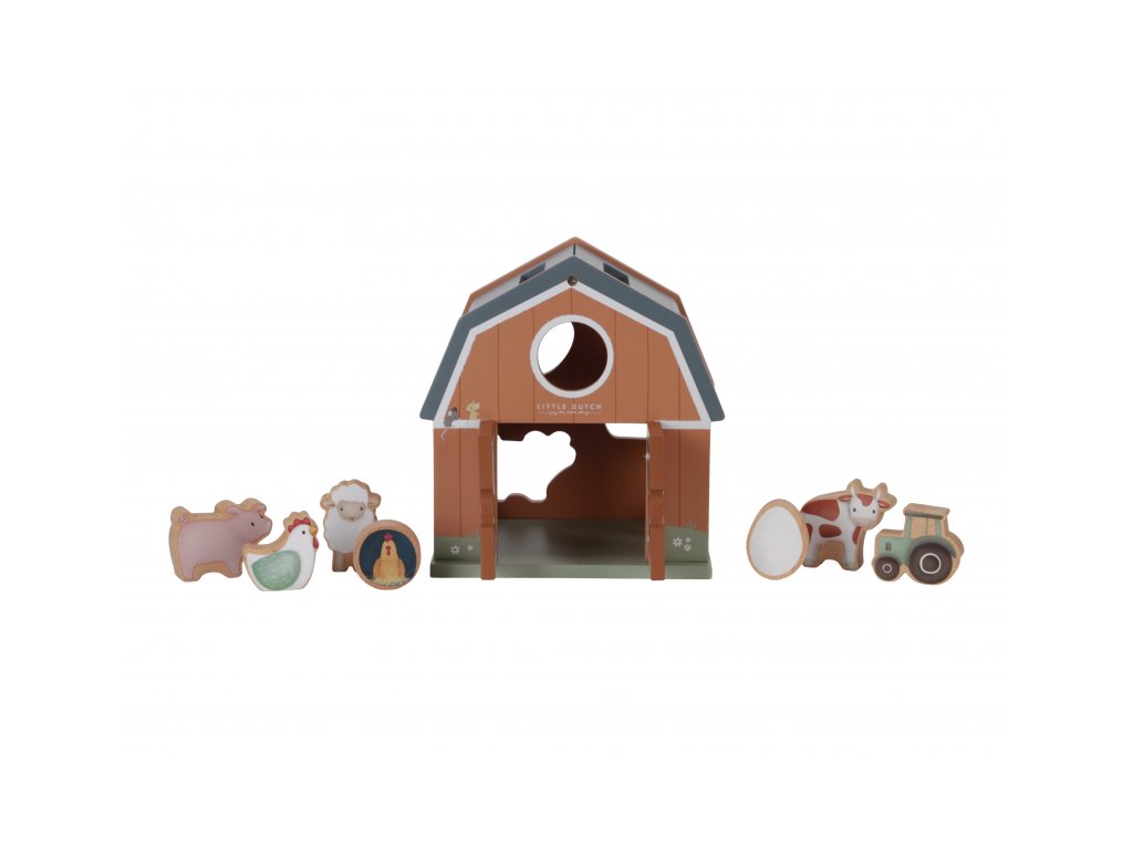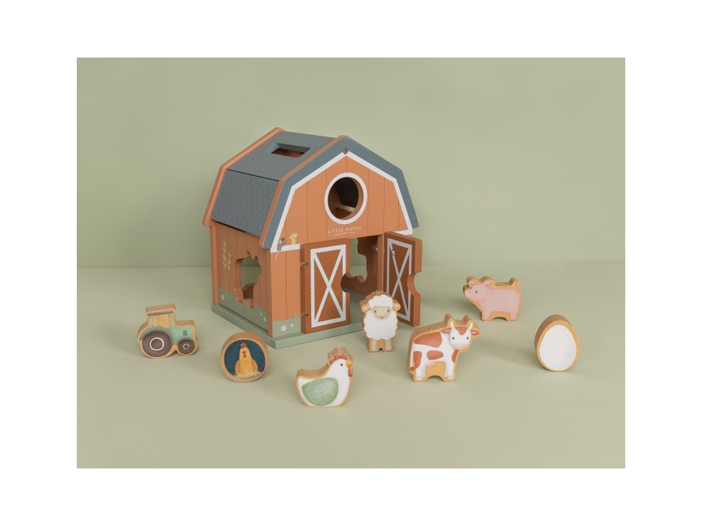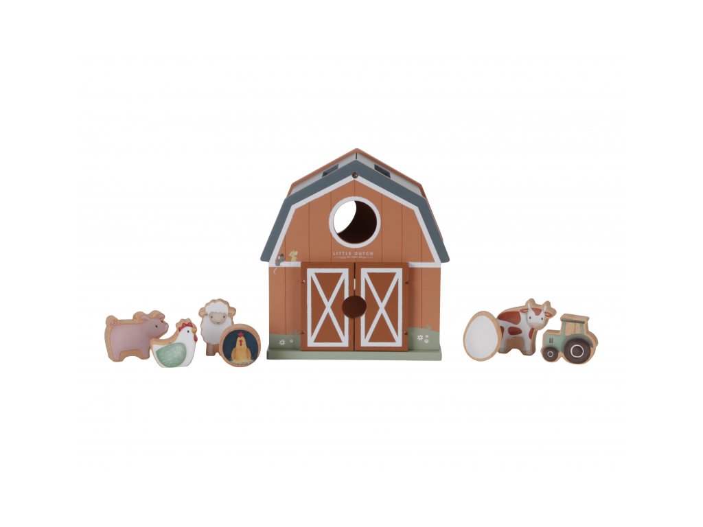 Drevený domček v podobe stodoly pre zvieratká učí deti kreatívnym spôsobom rozpoznávať tvary a zdokonaliť svoju koordináciu rúk a očí. Malé ručičky ľahko uchopia figúrky rôznych tvarov a potom ich zatlačia do správneho otvoru.