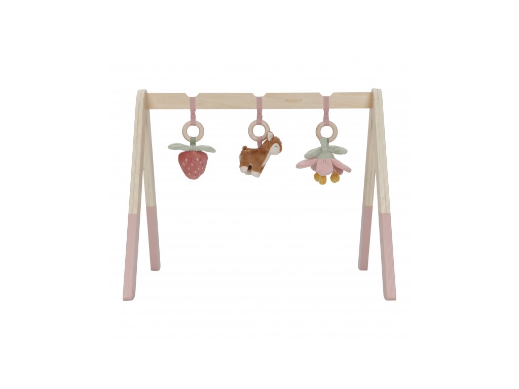 Štýlová drevená hrazdička s tromi zavesenými plyšovými hračkami v podobe srnky, jahôdky a kvetiny poskytne vášmu bábätku veľa zábavy pri hraní na deke. Jednotlivé hračky lákajú dieťa na skúmanie a dotýkanie, pri pohybe hrkajú a šuštia.