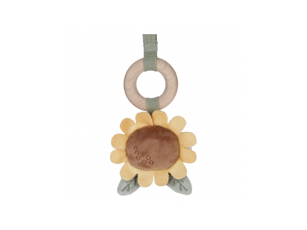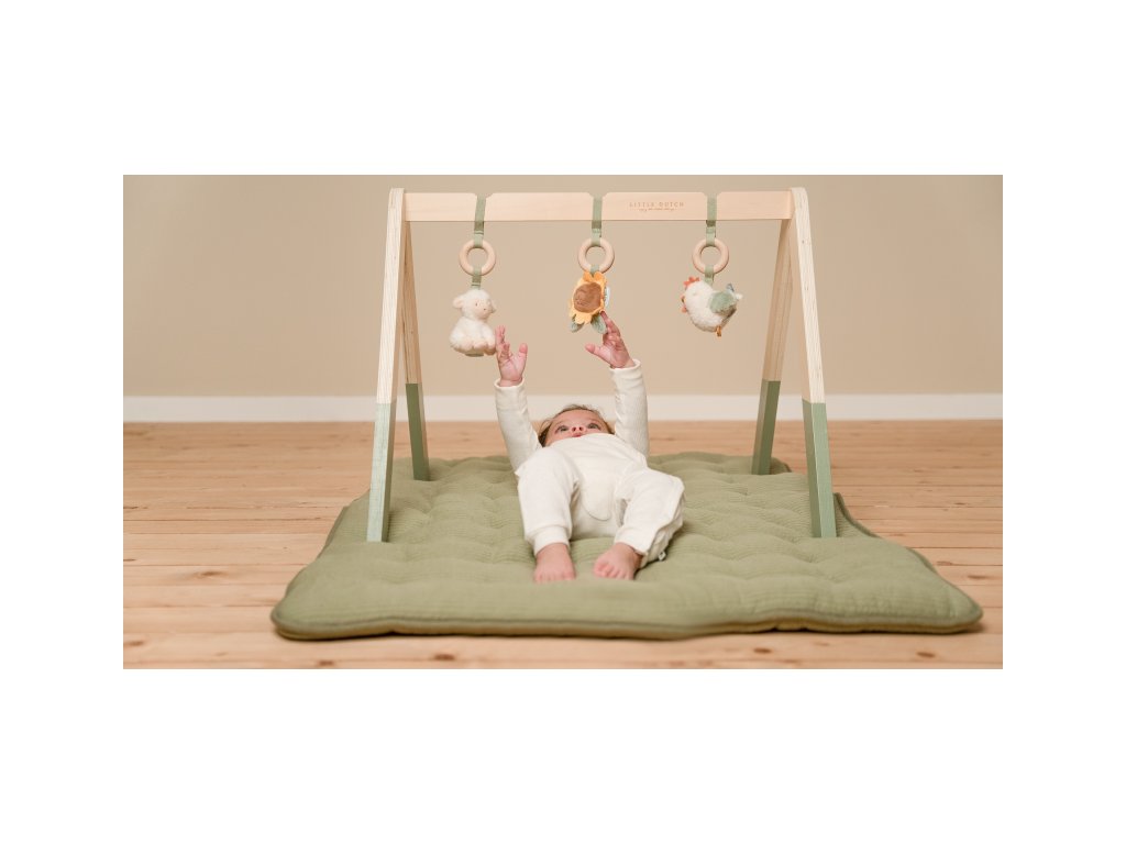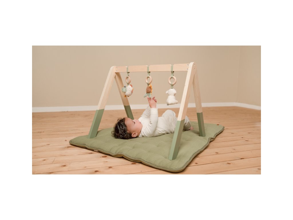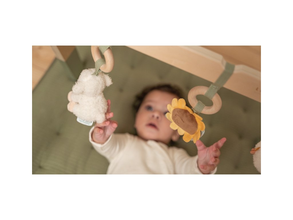Štýlová drevená hrazdička s tromi zavesenými plyšovými hračkami v podobe ovečky, slnečnice a vtáčika poskytne vášmu bábätku veľa zábavy pri hraní na deke. Jednotlivé hračky lákajú dieťa na skúmanie a dotýkanie, pri pohybe hrkajú a šuštia.