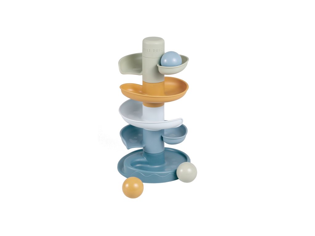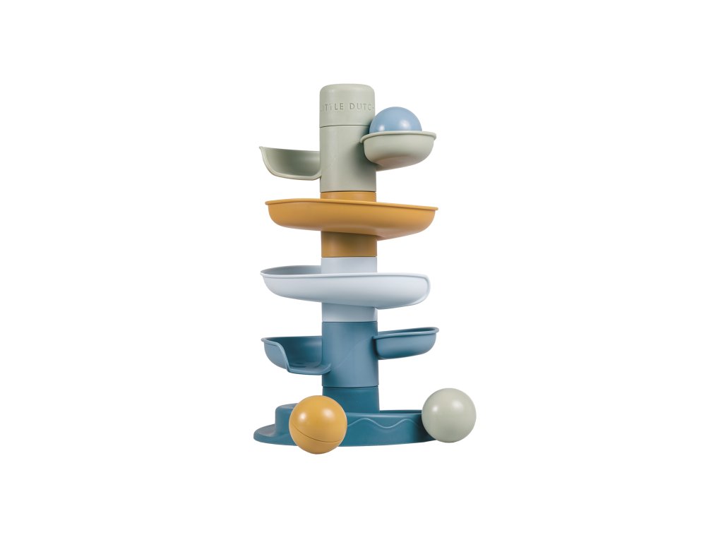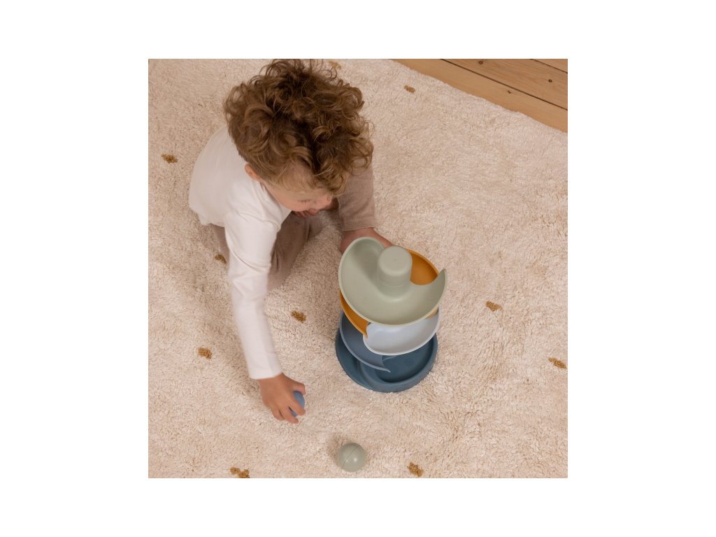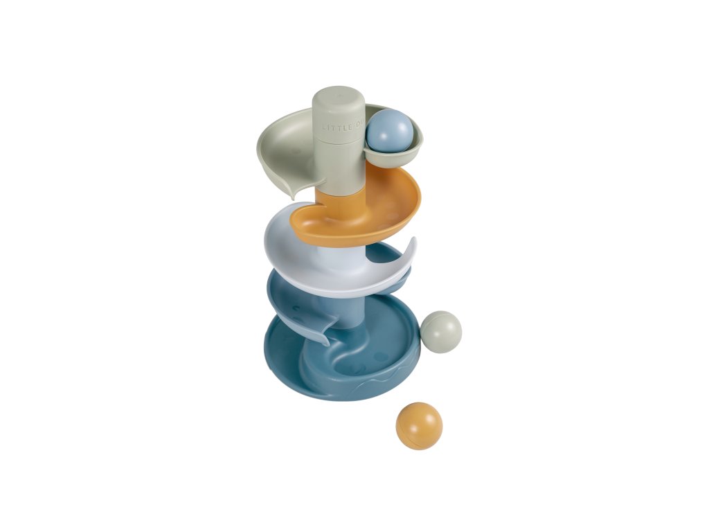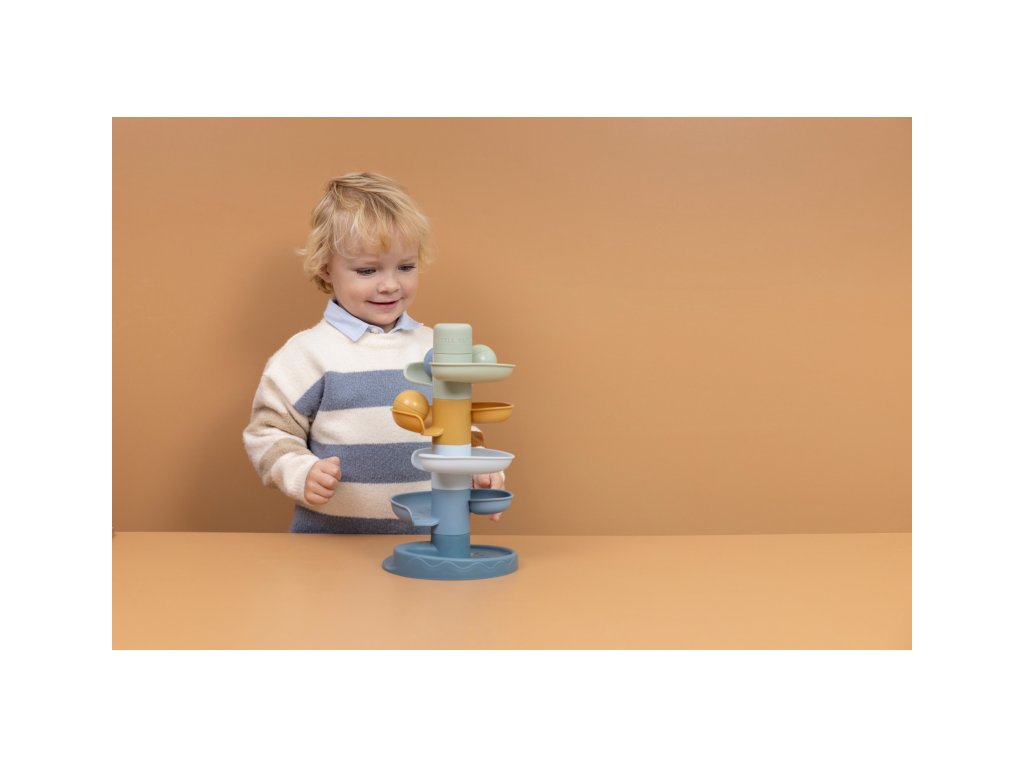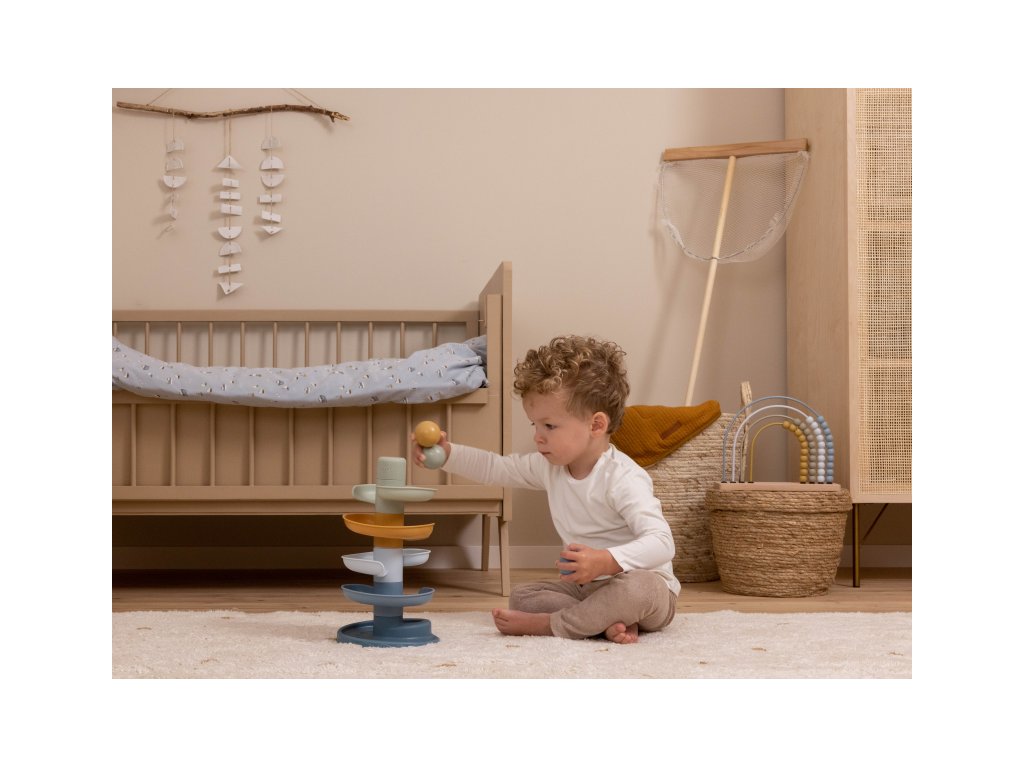 Sledujte s vašim dieťaťom, ako sa loptičky kotúľajú dookola jedna za druhou! Dráhu v jemných pastelových farbách ľahko zostavíte z piatich dielov a zábava môže začať.