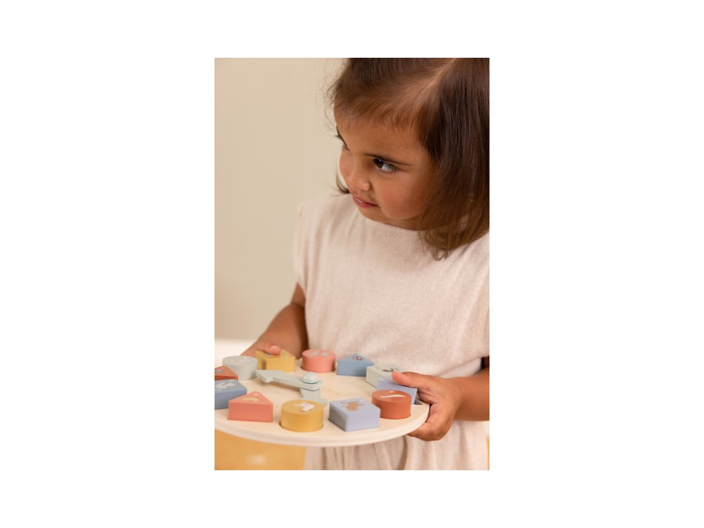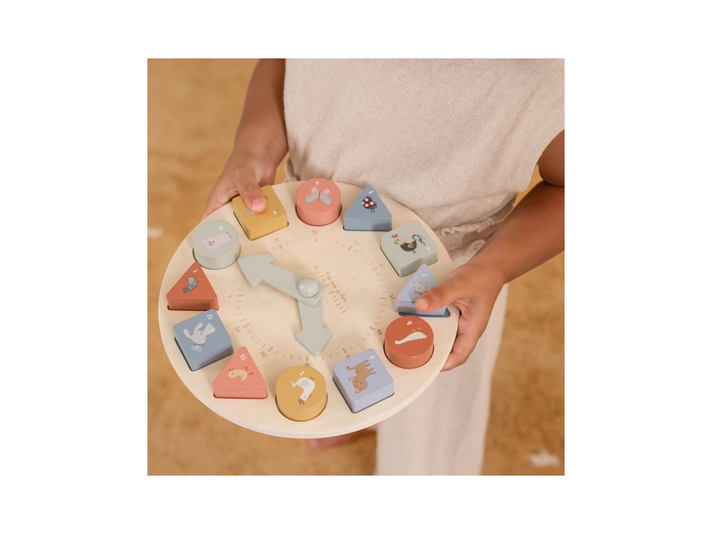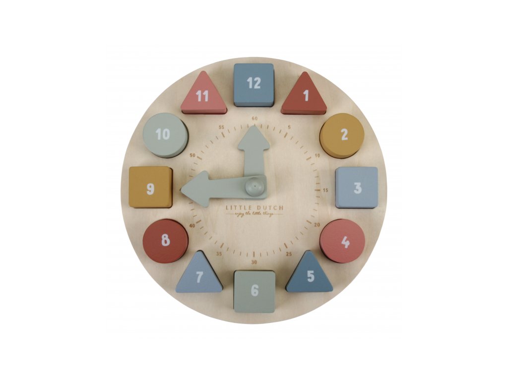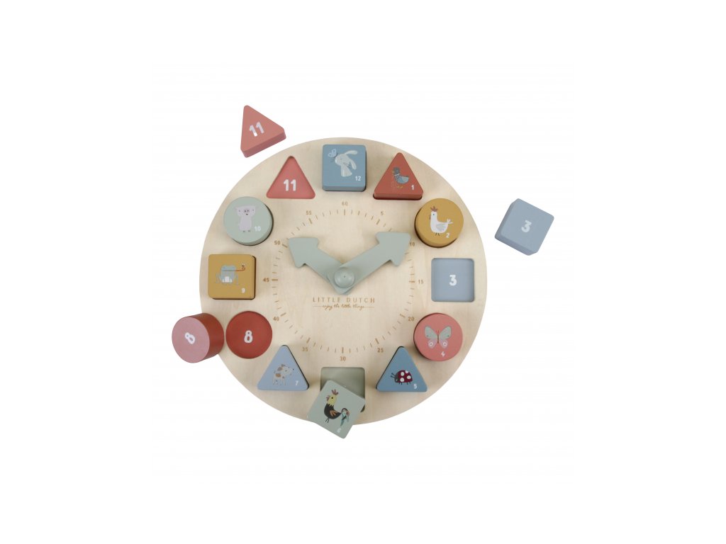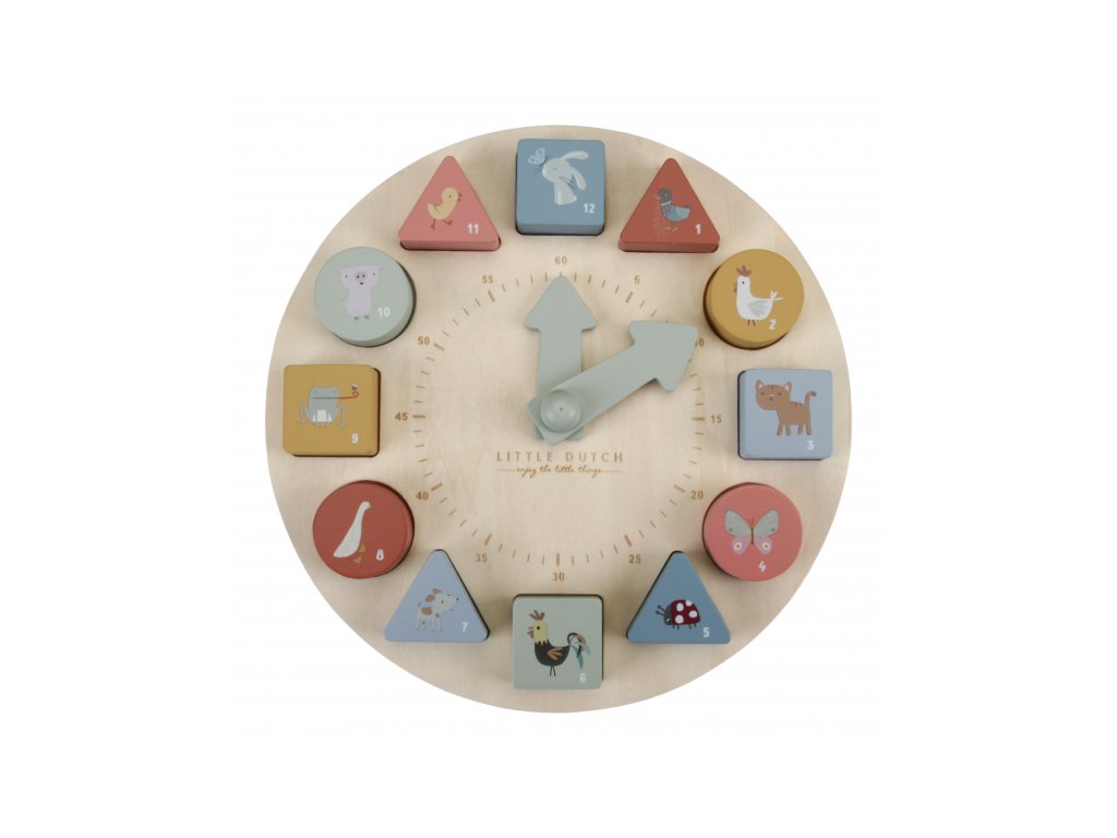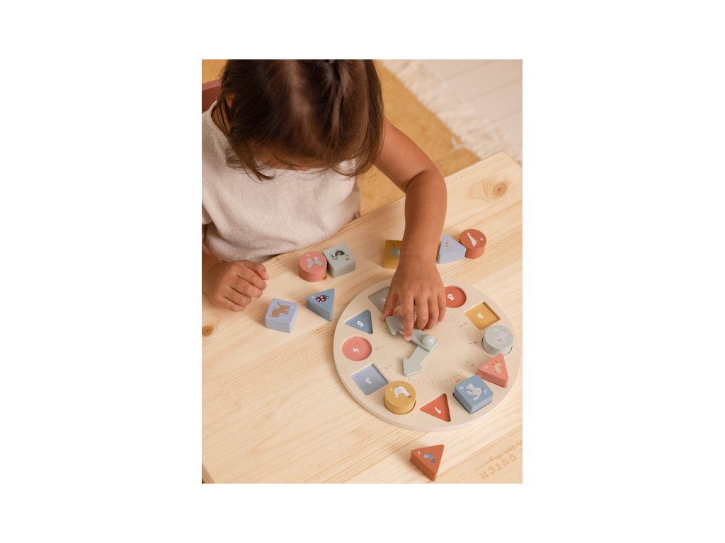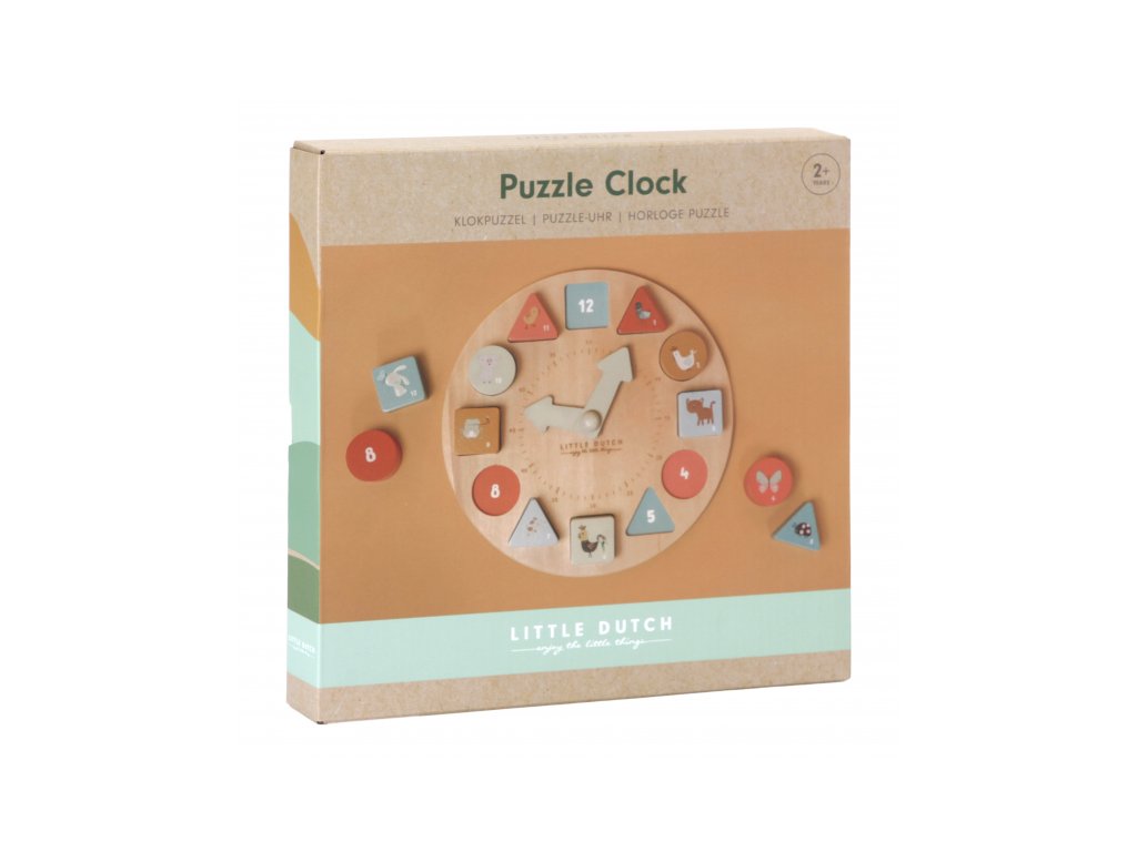 Koľko je hodín? Tieto vzdelávacie drevené puzzle hodiny naučia vaše ratolesti udávať čas hravou formou. Hodiny majú pohyblivé ručičky a obsahujú 12 kociek s číslami, ktoré sa zmestia do zodpovedajúcich priehradok. Každý blok je krásne ilustrovaný zvieratkom, aby bolo učenie ešte zábavnejšie. Puzzle hodiny Little Dutch taktiež pomáhajú deťom rozpoznávať farby, čísla a tvary. Učia sa počítať a rozpoznávať čísla a farby umiestnením správneho bloku na správne miesto.