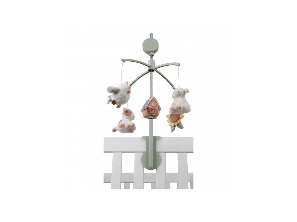 Kolotoč s naťahovacím hudobným boxom hrá nežnú uspávanku pre pokojné zaspávanie. Pozornosť dieťaťa upútajú otáčajúce sa plyšové hračky v podobe ovečky, sliepočky, kravičky, slnečnice a domčeka. Kolotoč ľahko pripevníte na bočnicu postieľky.