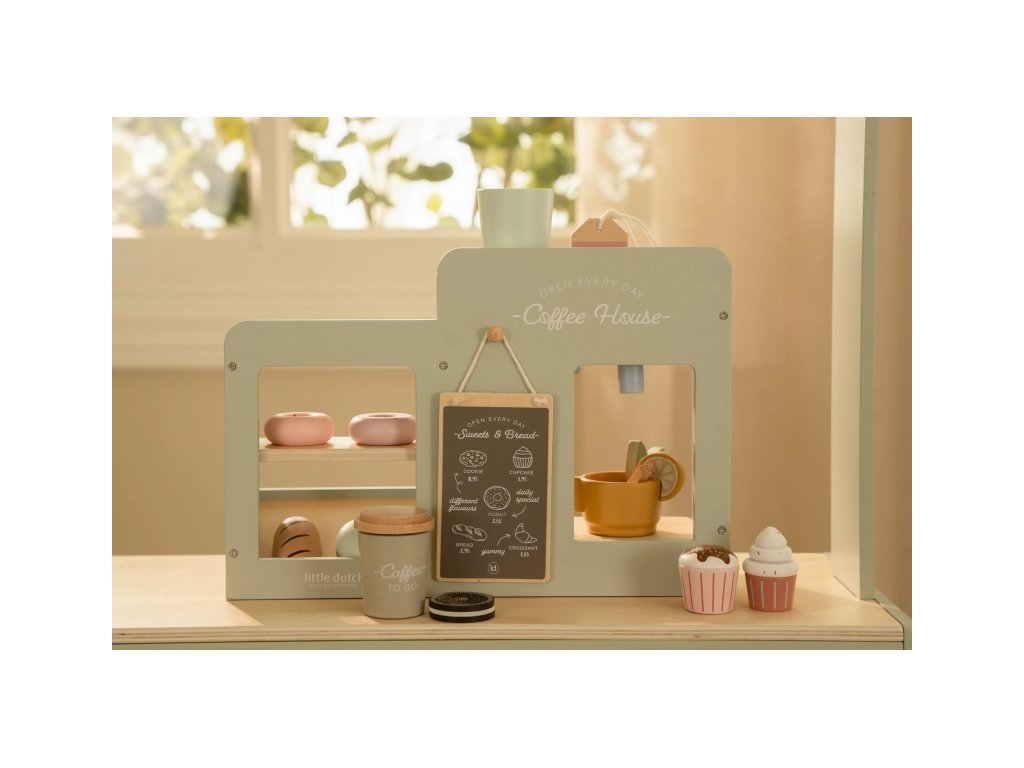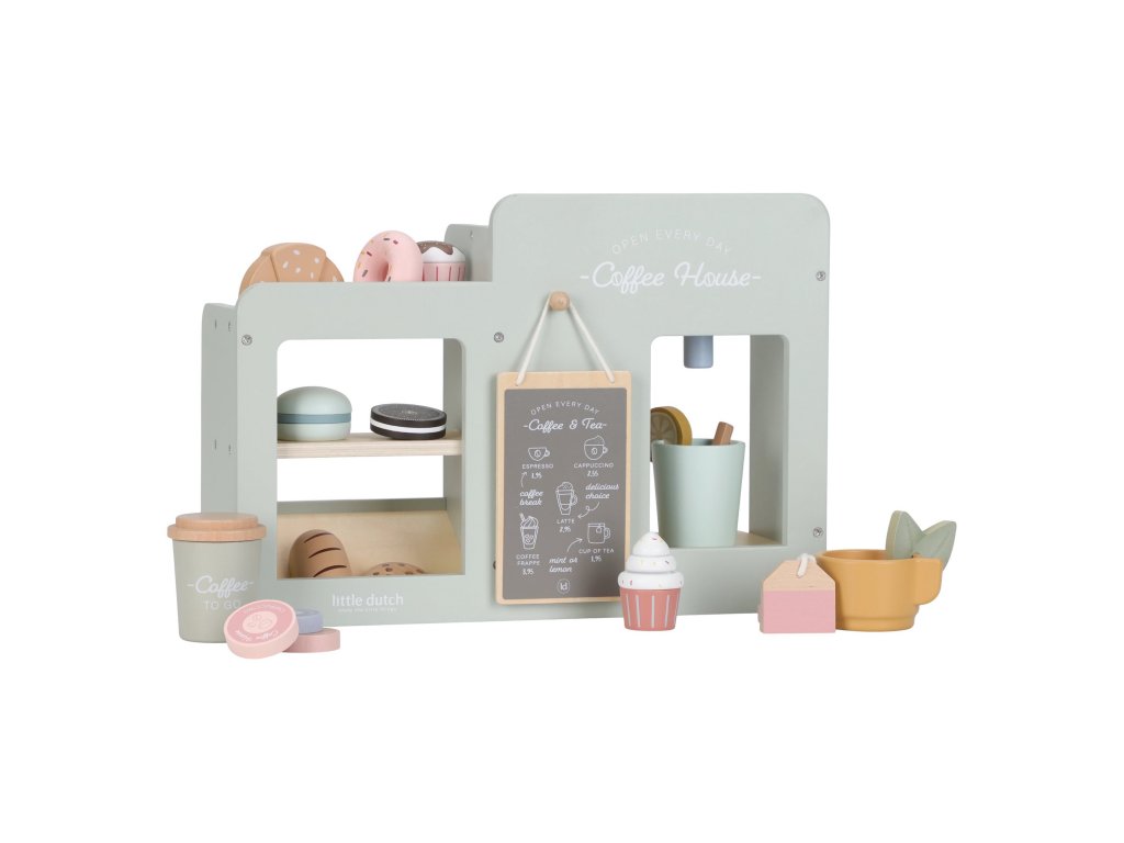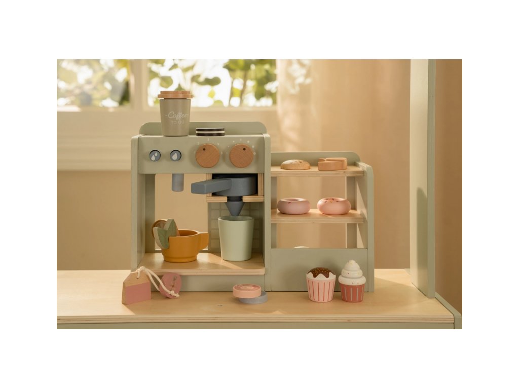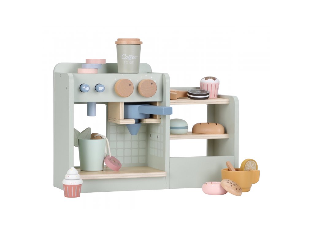 Súčasťou setu je kávovar, čajovar, úložný priestor na hrnčeky a vitrína na vystavenie sladkostí a sendvičov. Deti môžu servírovať čaj s koláčikom alebo cappuccino s tortičkami a pozvať rodinu i kamarátov do svojej vlastnej kaviarne.