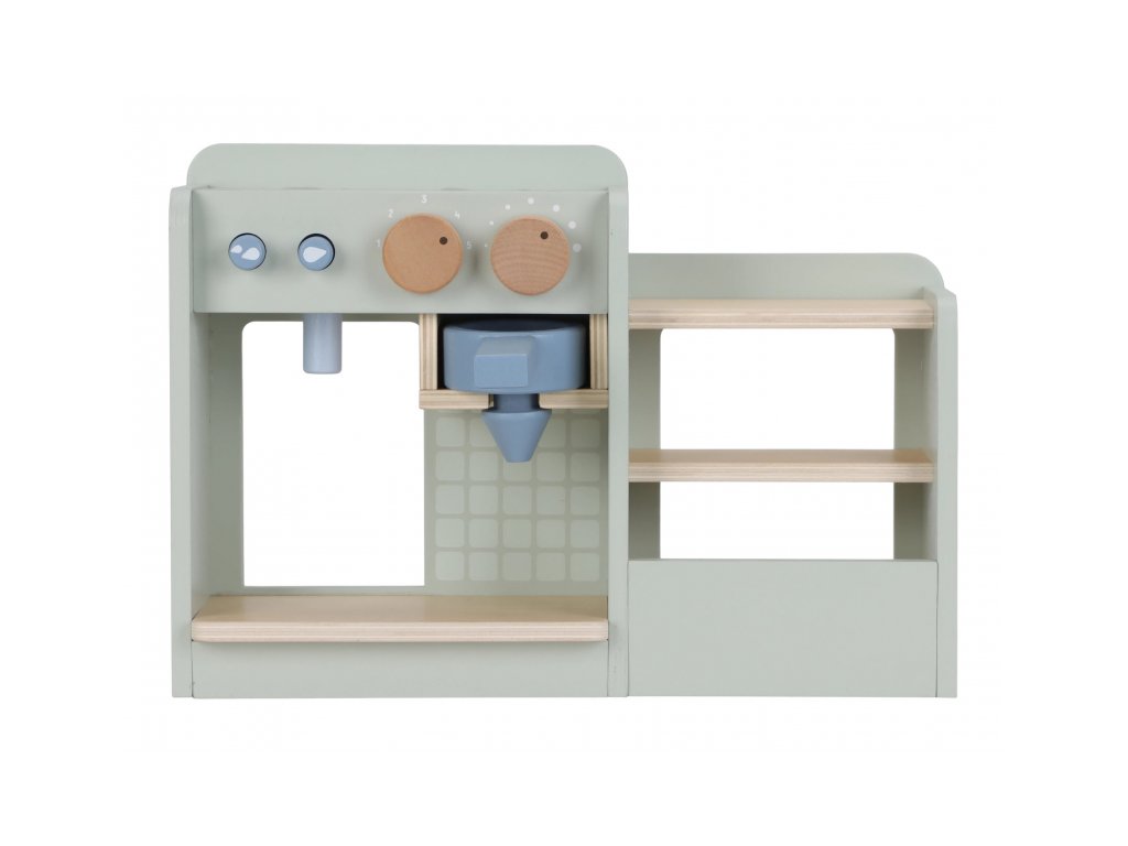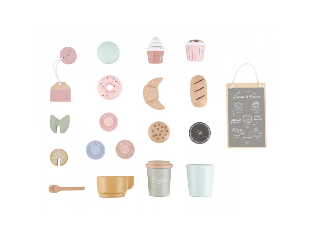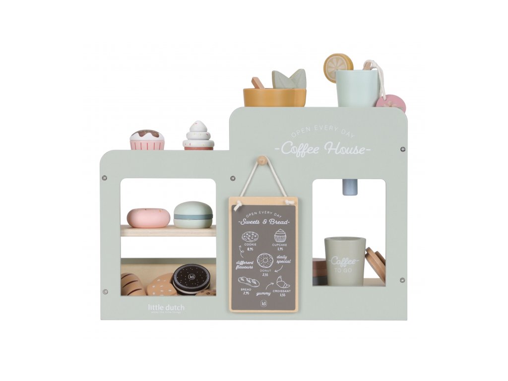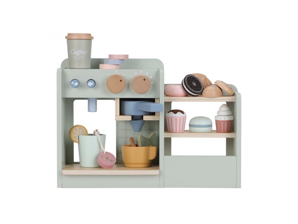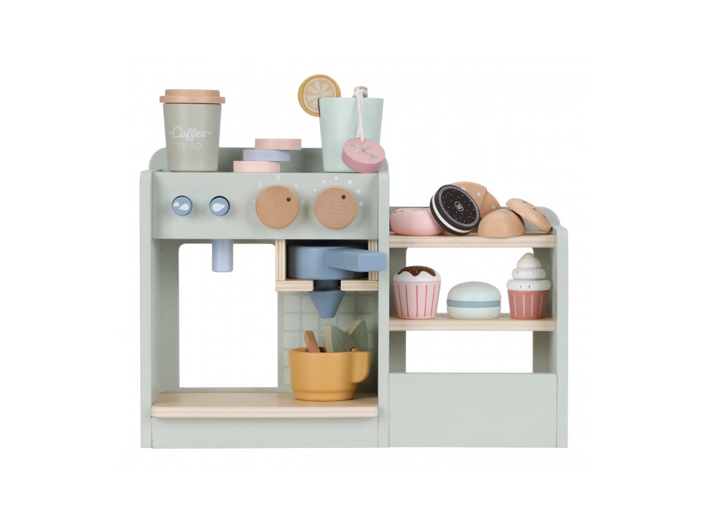 Súčasťou setu je kávovar, čajovar, úložný priestor na hrnčeky a vitrína na vystavenie sladkostí a sendvičov. Deti môžu servírovať čaj s koláčikom alebo cappuccino s tortičkami a pozvať rodinu i kamarátov do svojej vlastnej kaviarne.