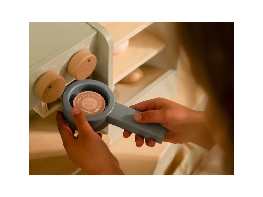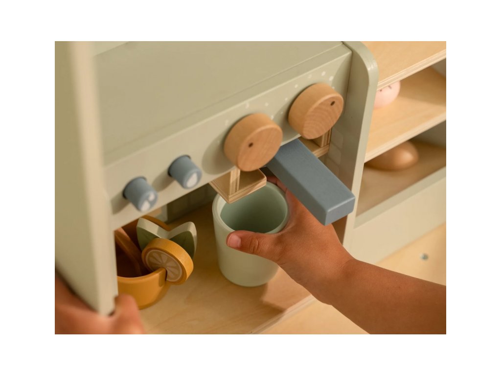 Vitajte v najútulnejšom kávovom kútiku v meste! Tento krásny drevený kávovar s bohatým príslušenstvom premení každé detské hranie na nezabudnuteľný zážitok. Malí baristi môžu stláčať tlačidlá, voliť nastavenia a vkladať kapsule ako v skutočnej kaviarni – a pripraviť tak kávu alebo čaj presne podľa priania svojich zákazníkov.