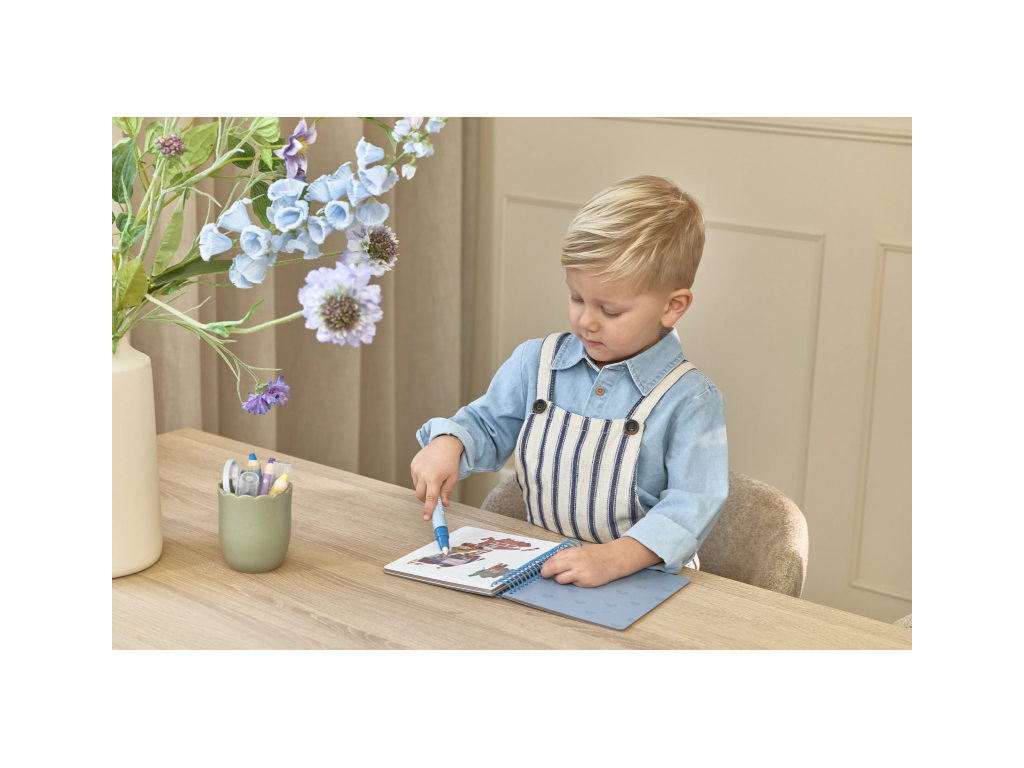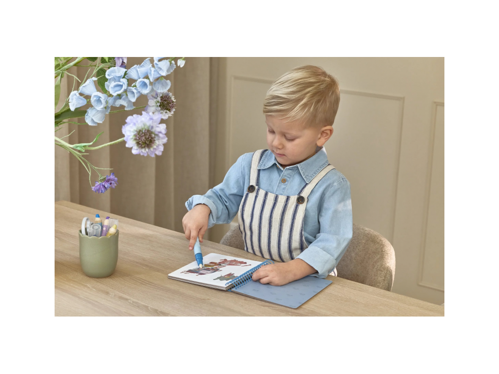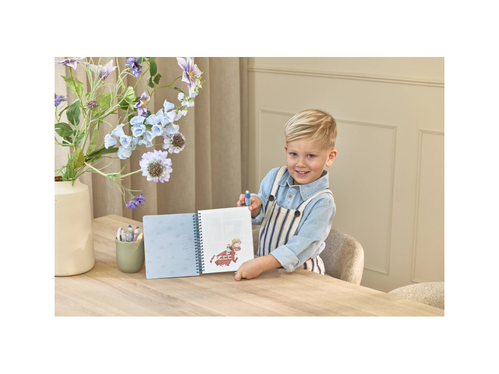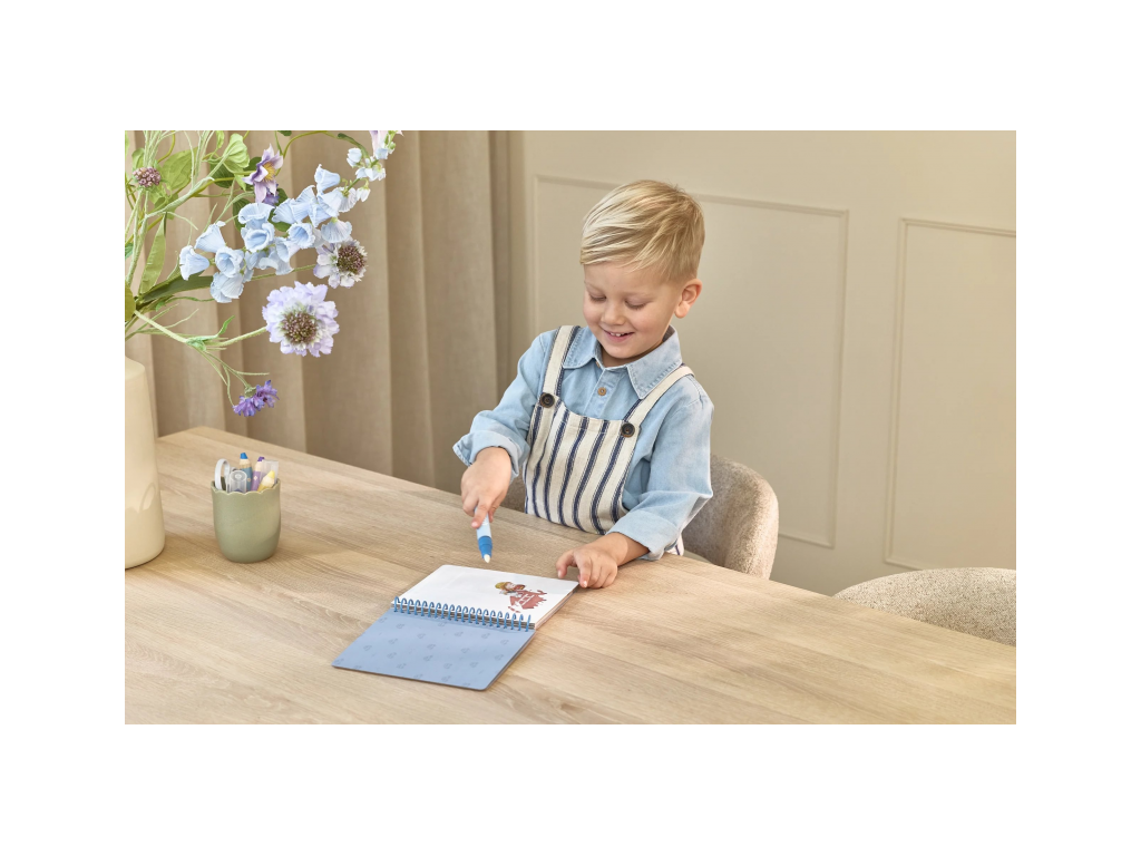 Knižka s piatimi ilustrovanými stránkami je opakovane použiteľná. Vďaka krúžkovej väzbe z pevného kartónu drží otvorená na pohodlné maľovanie.