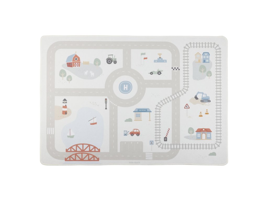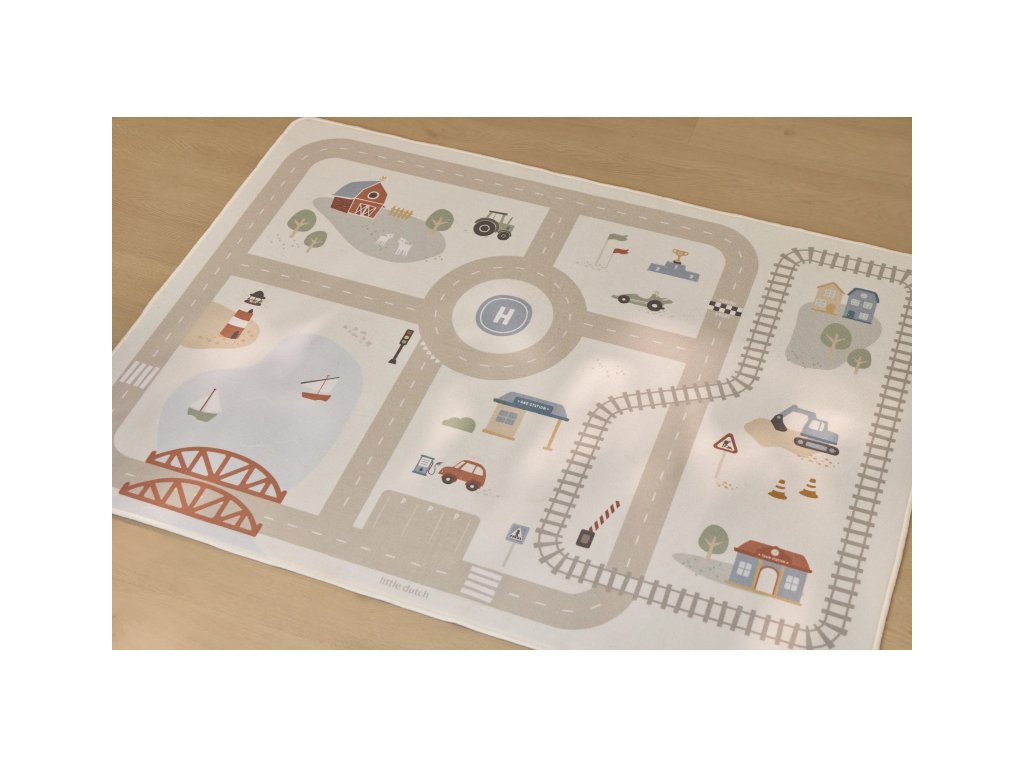 Detský koberec Little Dutch premení podlahu v detskej izbe na živý svet plný ciest, zákrut a križovatiek, kde sa príbehy tvoria samé. Deti môžu parkovať autá do garáže, prechádzať mestom alebo sa vydať na cestu vlakom – dizajn koberca ich prirodzene vedie a podporuje fantáziu aj sústredenú hru. Koberec bude skvelým doplnkom pri hraní s autíčkami, vláčikmi, stavebnicami alebo ďalšími hračkami.