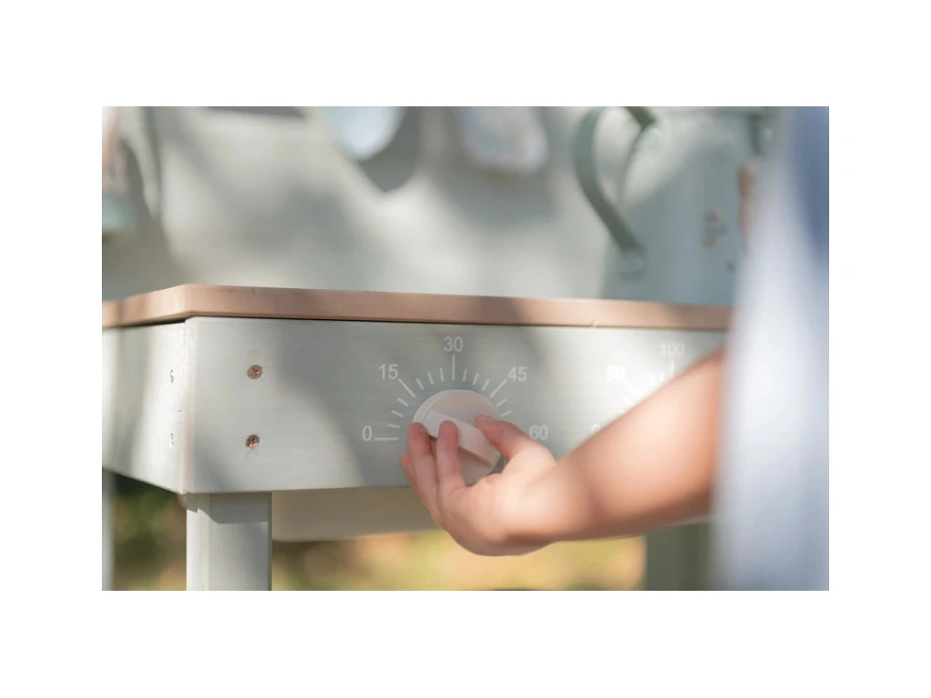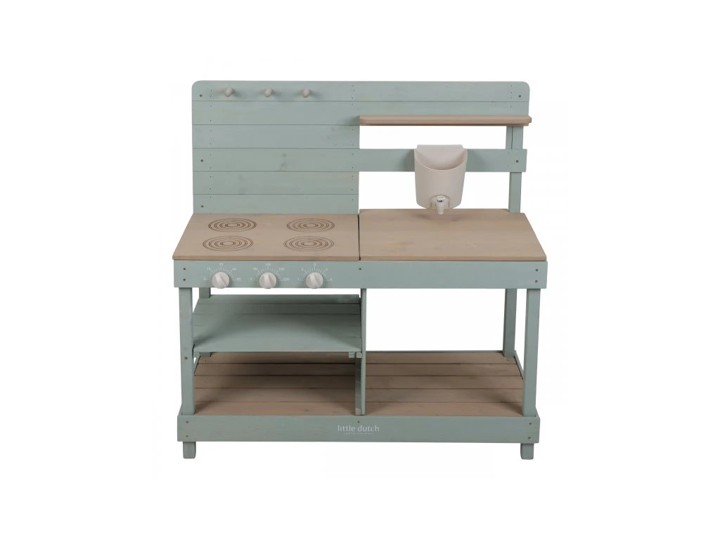 Drevená vonkajšia kuchynka je ideálna hračka na záhradu pre malých záhradníkov i malých kuchárov, ktorí milujú tvorenie z piesku, vody a blata. Kuchynka so sporákom má otočné gombíky, dva drezy a dokonca funkčný kohútik s nádržkou na vodu, takže si dieťa môže samo pustiť vodu a doplniť suroviny na „varenie“ vonku. Praktický detail sú tiež dve veľké vaničky schované pod odklopnými doskami, ktoré sú ako stvorené na hranie s vodou.