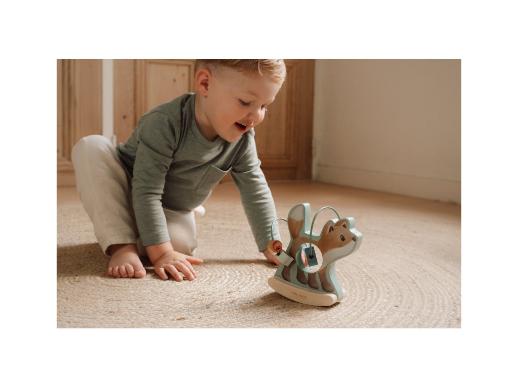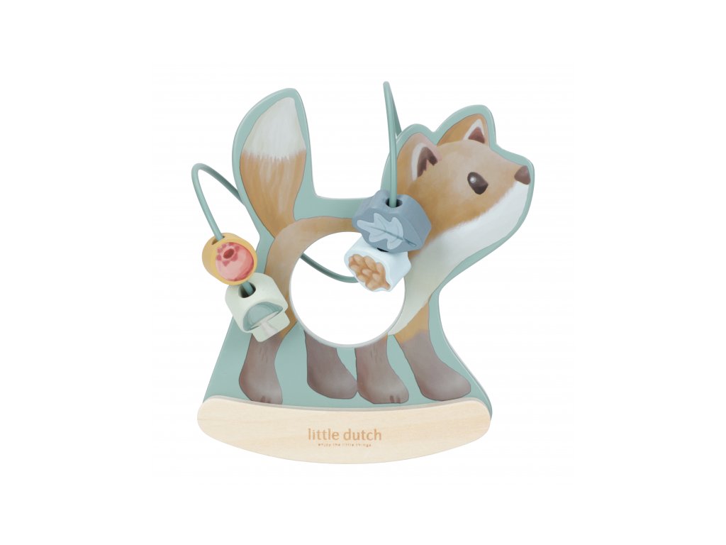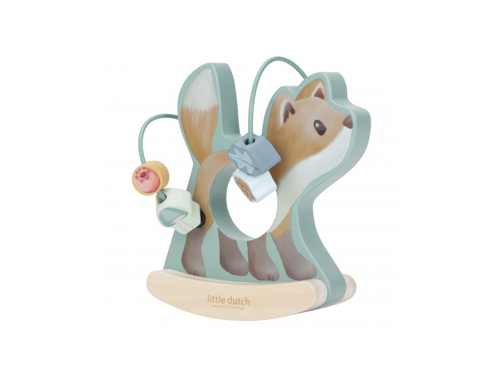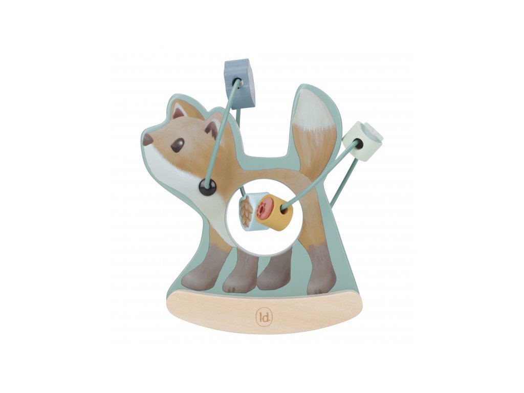 Drevená hračka v podobe nežnej líšky sa po postavení na podlahu či stôl jemne hojdá a pritom sa okolo nej na špirále pohybujú posuvné drevené korálky s potlačou hubky, šišky, lístka a brusnice. Hračka je ideálna pre rozvoj koordinácie ruka/oko dieťaťa slúži aj ako krásna dekorácia v detskej izbe.