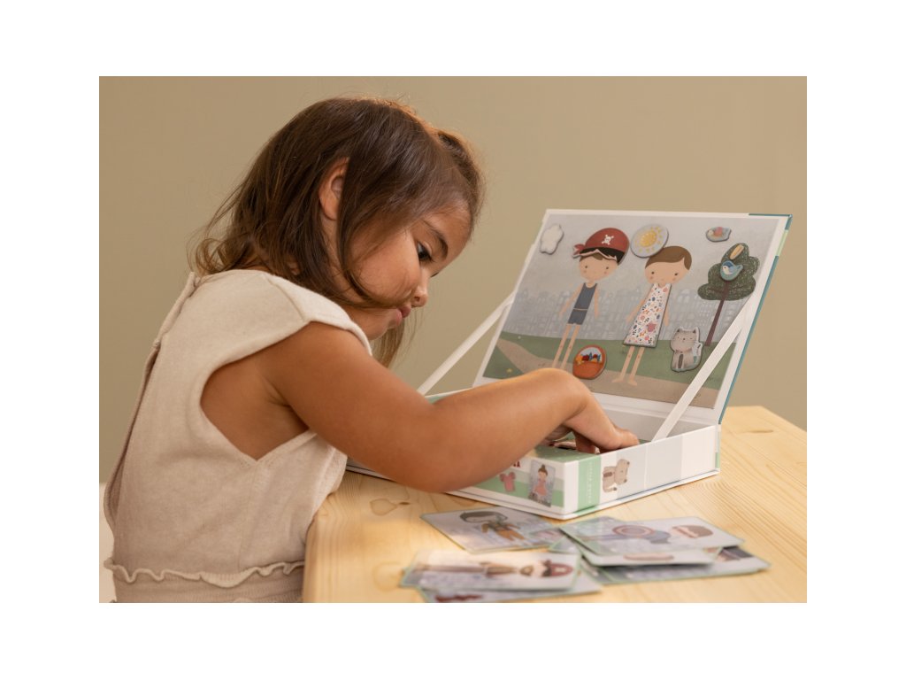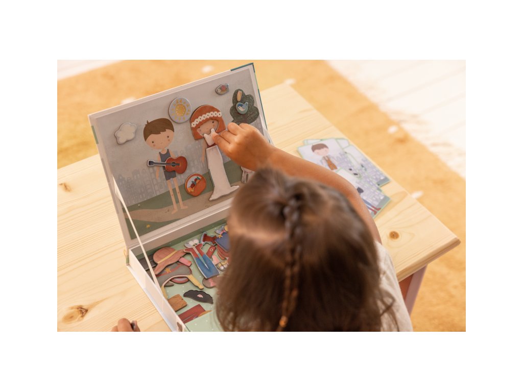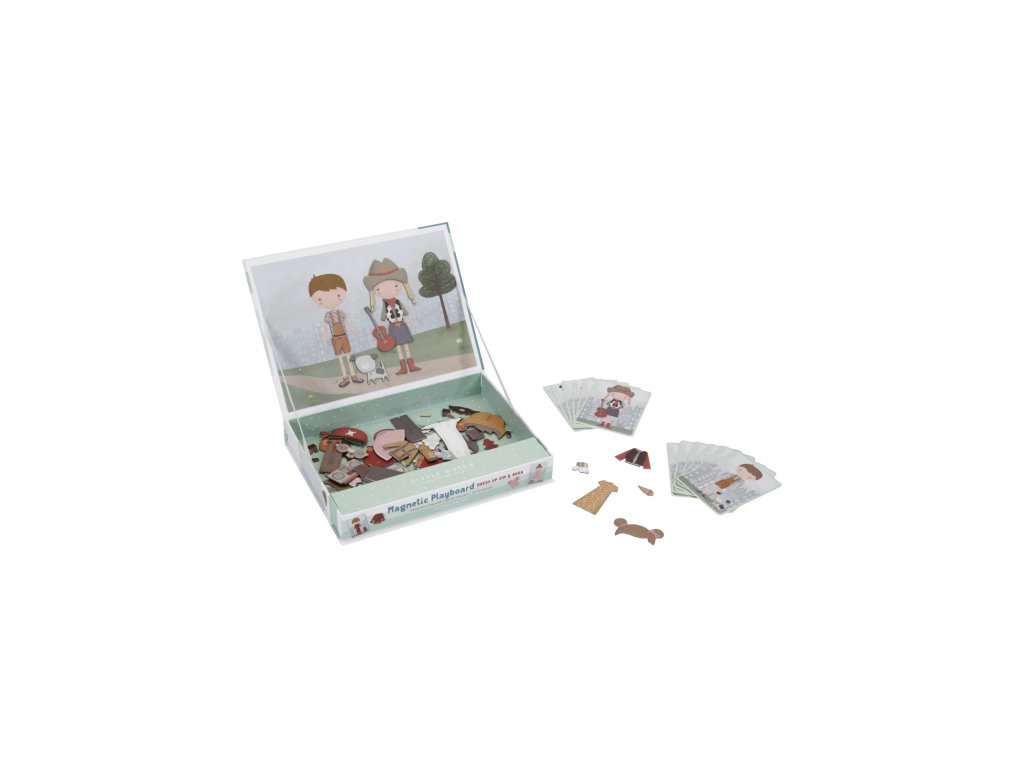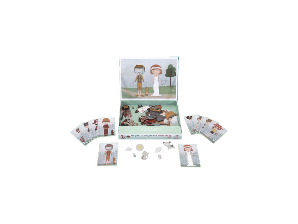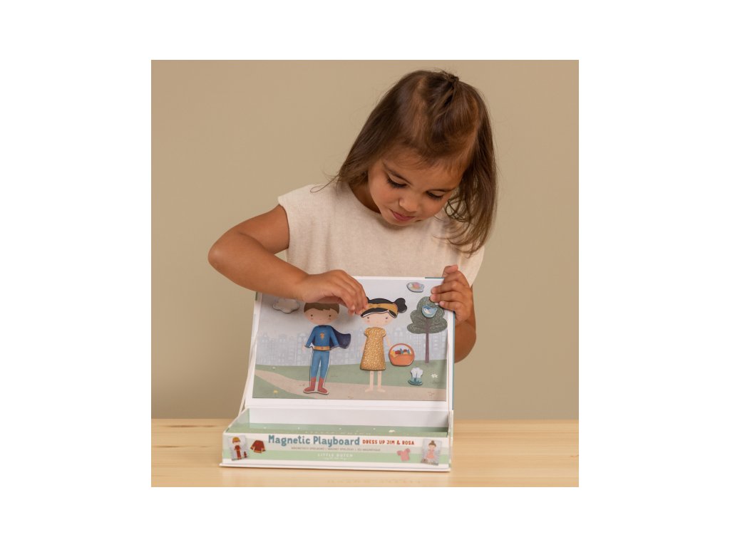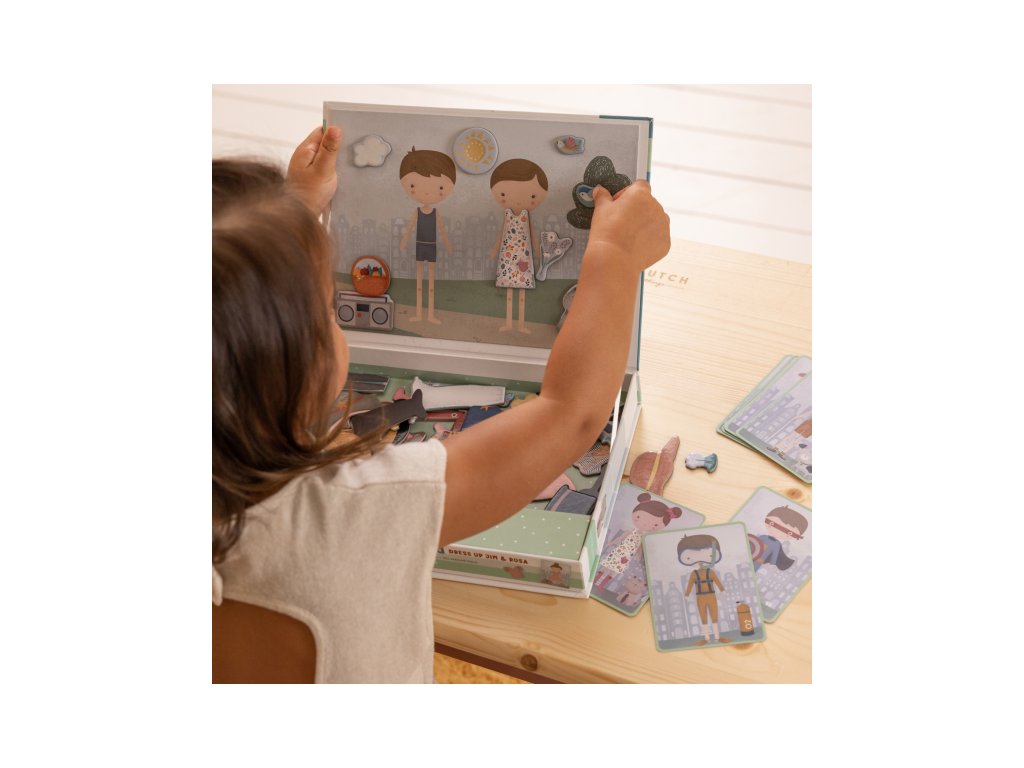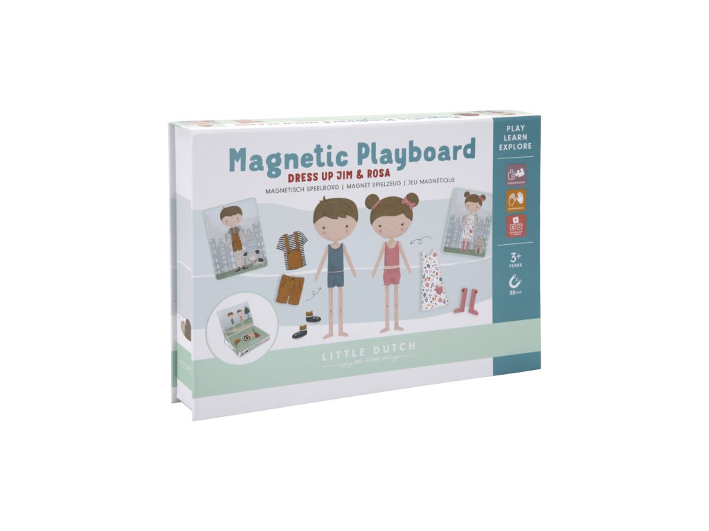 Oblečte sa s Jimom a Rosou! S touto magnetickou hrou môžete napodobniť oblečenie, ktoré je na karte pomocou magnetických dielikov na doske. Alebo použite vlastnú predstavivosť. Existuje nekonečné množstvo kombinácií, ktoré zaručujú zábavu a podporujú slovnú zásobu a koordináciu. Táto skvelá hra zabaví deti doma, ale aj na cestách.