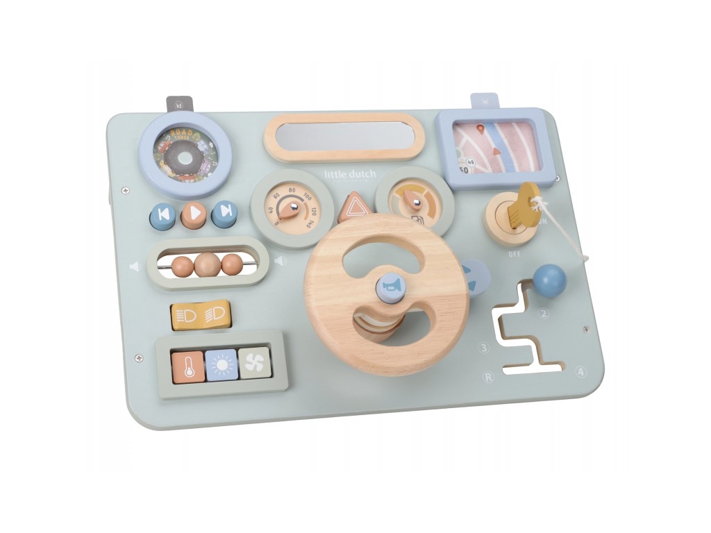 Dřevěný hrací pult s volantem láká děti na vlastní dobrodružnou jízdu. Dítě může otáčet volantem, mačkat tlačítka a objevovat veselé zvuky, které podporují aktivní a nápaditou hru. Součástí jsou také kartičky, díky kterým si dítě může „naplánovat trasu“ a vymýšlet vlastní příběhy. Pult je vyrobený z pevného dřeva v jemných pastelových barvách, takže se stane i krásným doplňkem dětského pokoje a dobře se kombinuje s dalšími dřevěnými hračkami.