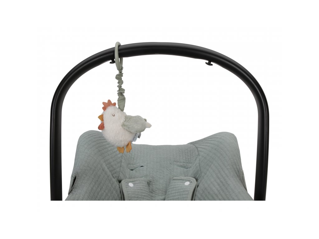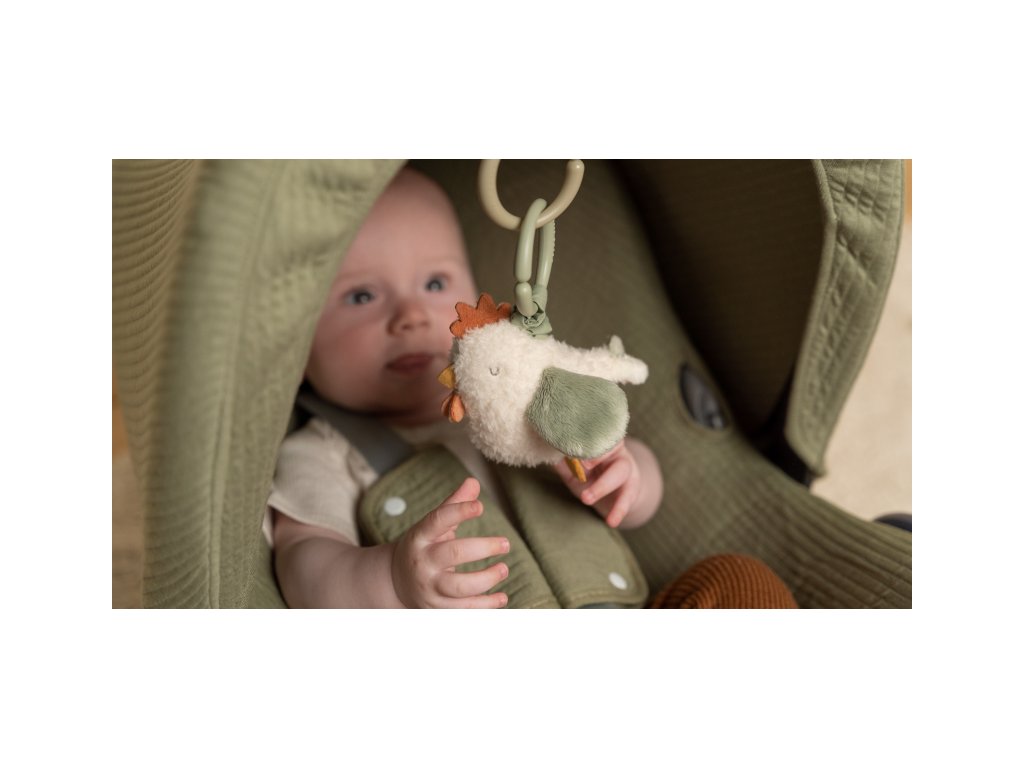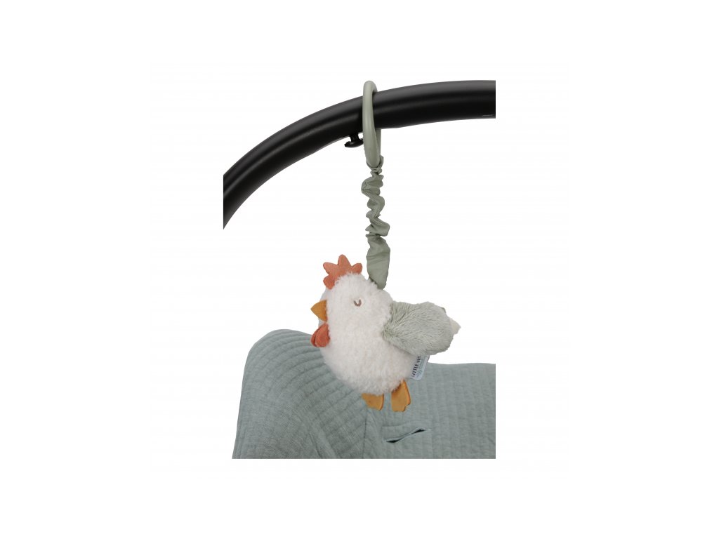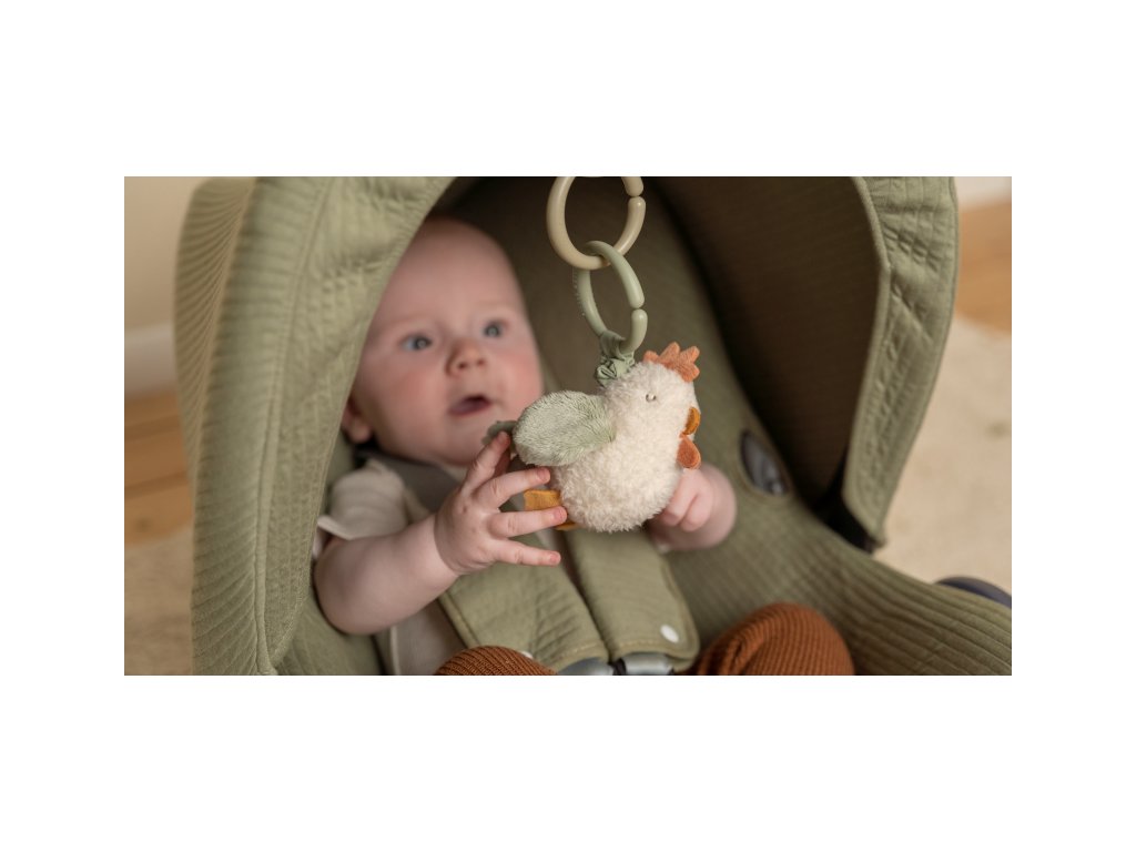 Plyšová sliepočka po zatiahnutí za šnúrku vibruje a smiešne poskakuje. Hračku je možné ľahko zavesiť na autosedačku, kočík či hrazdu na hracej deke.